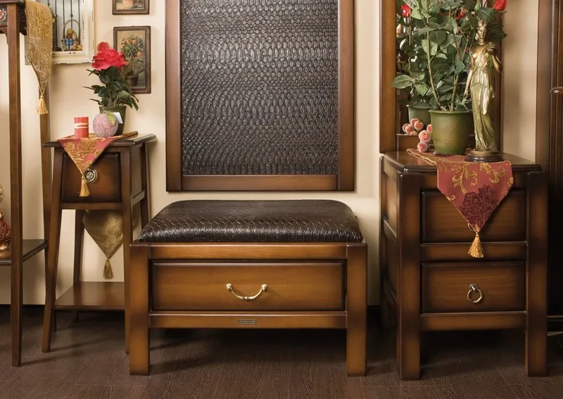 - Классические. Верное решение – выбрать банкетку в классике или неоклассике: подойдет к любой прихожей. К этой группе относят итальянский, викторианский, колониальный стили.
