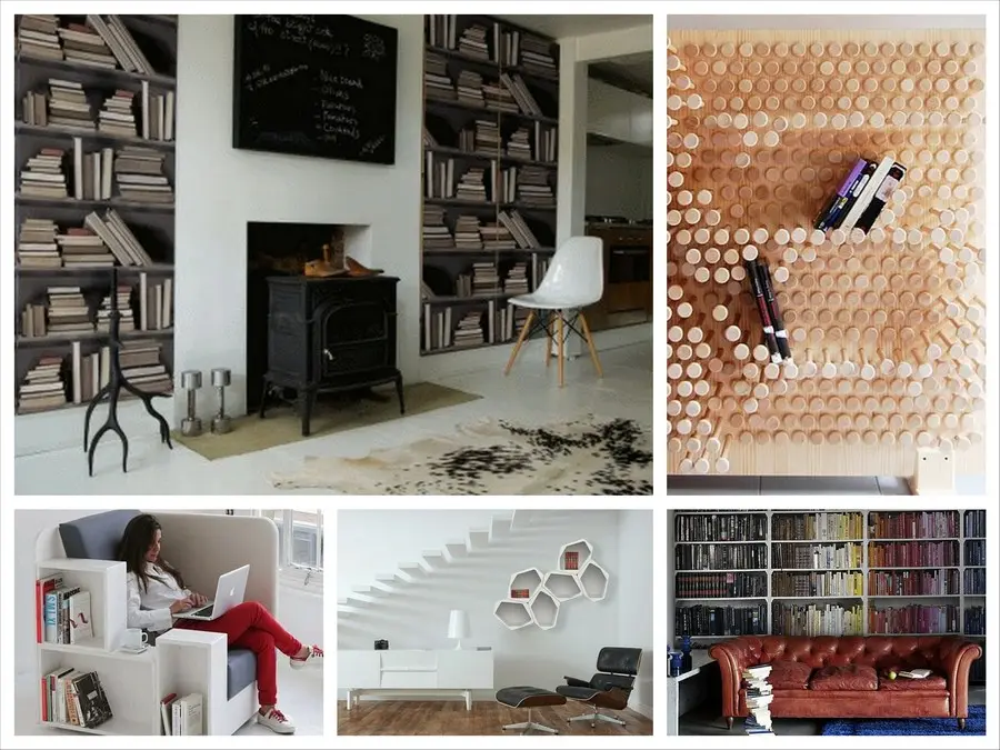 Книжные шкафы или полки могут стать главной деталью комнаты, создавая единство стиля. Если размеры помещения не позволяют тратить место на полки, можно использовать зону в углу или за дверью, которые трудно оформлять мебелью. Полки в таких местах экономят пространство и дают место для хранения вещей.