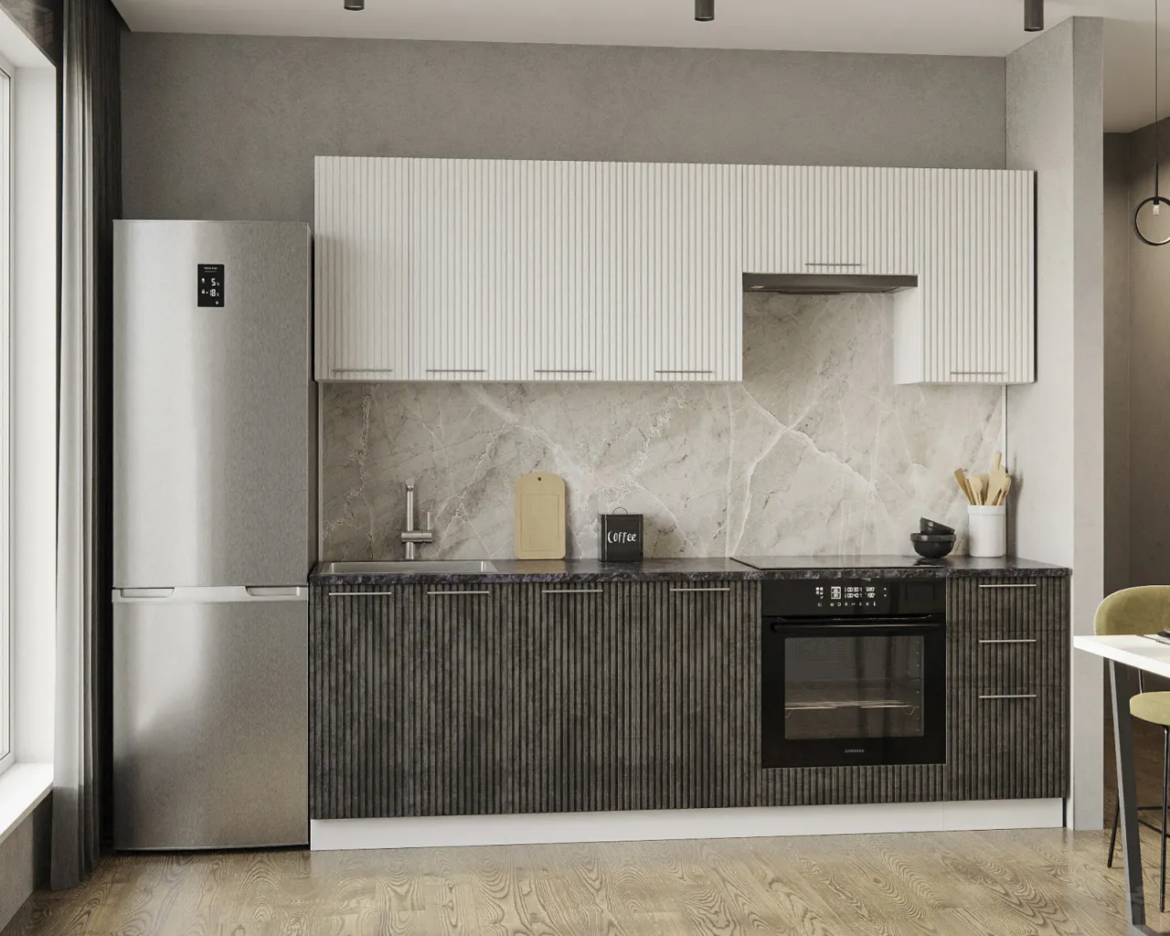 Абрис - стильный и универсальный кухонный гарнитур. Возможна правосторонняя или левосторонняя сборка. В любой момент можно изменить конфигурацию кухонного гарнитура “Абрис”, изменив интерьер кухни.