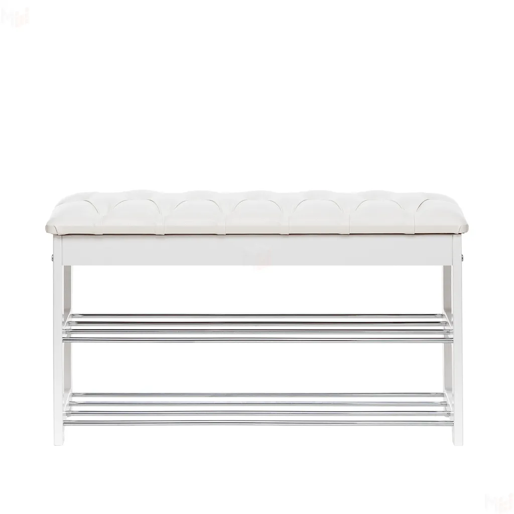 Широкая двухместная банкетка с мягким сиденьем и полкой для обуви. Она сделана в незамысловатом дизайне и органично впишется в любой интерьер.