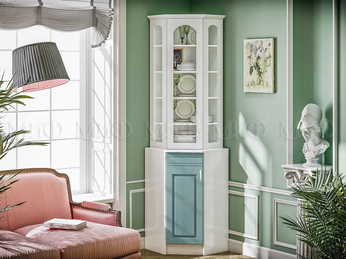 Буфет "Констанция" идеально впишется в кухонный интерьер, выполненный в классическом или дворцовом стиле. Угловая модель имеет изысканный дизайн и стильное цветовое оформление. Ее легкость и изящество подчеркивают элегантные фасады, изготовленные из прозрачного стекла. Буфет оснащен множеством удобных полочек. Здесь найдется место для тарелок, чашек, кофейников, молочников, заварочных чайников и другой посуды. Буфет оформлен декоративным карнизом.