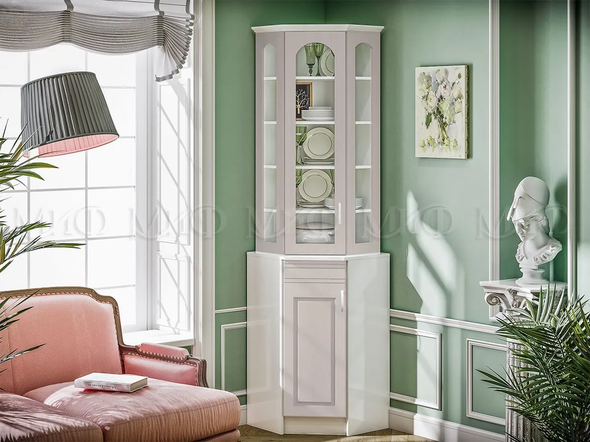 Буфет "Констанция" идеально впишется в кухонный интерьер, выполненный в классическом или дворцовом стиле. Угловая модель имеет изысканный дизайн и стильное цветовое оформление. Ее легкость и изящество подчеркивают элегантные фасады, изготовленные из прозрачного стекла. Буфет оснащен множеством удобных полочек. Здесь найдется место для тарелок, чашек, кофейников, молочников, заварочных чайников и другой посуды. Буфет оформлен декоративным карнизом.