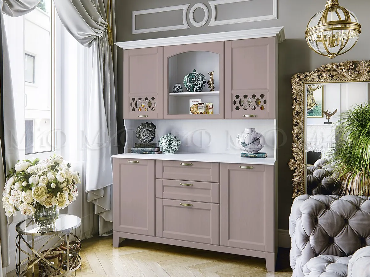 Каркас буфета выполнен из ЛДСП Белый, фасады МДФ Шарли Пинк.