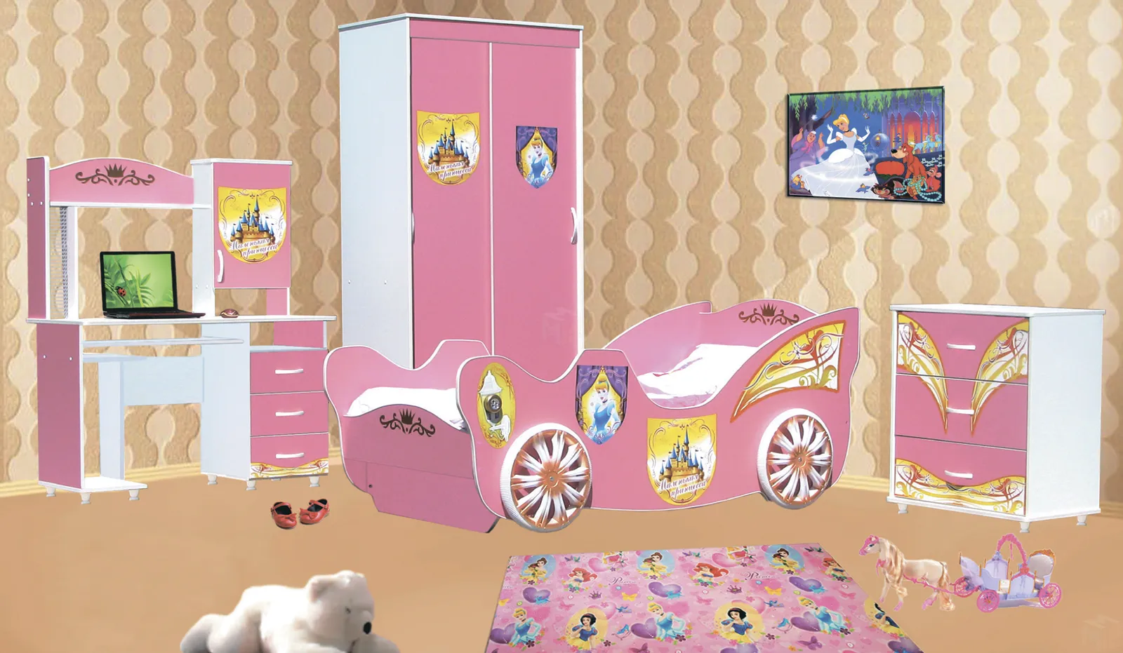 Модули входящие в комплект: Кровать Карета без матраса, Компьютерный стол Принцесса, Комод Принцесса , Шкаф-купе Принцесса.