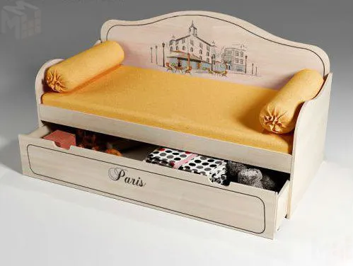 Париж, артикул 40010 - это кровать для детей в виде диванчика (конструкция из ЛДСП) с использованием фотопечати (прямая УФ-фотопечать) на спинке и выкатном ящике.