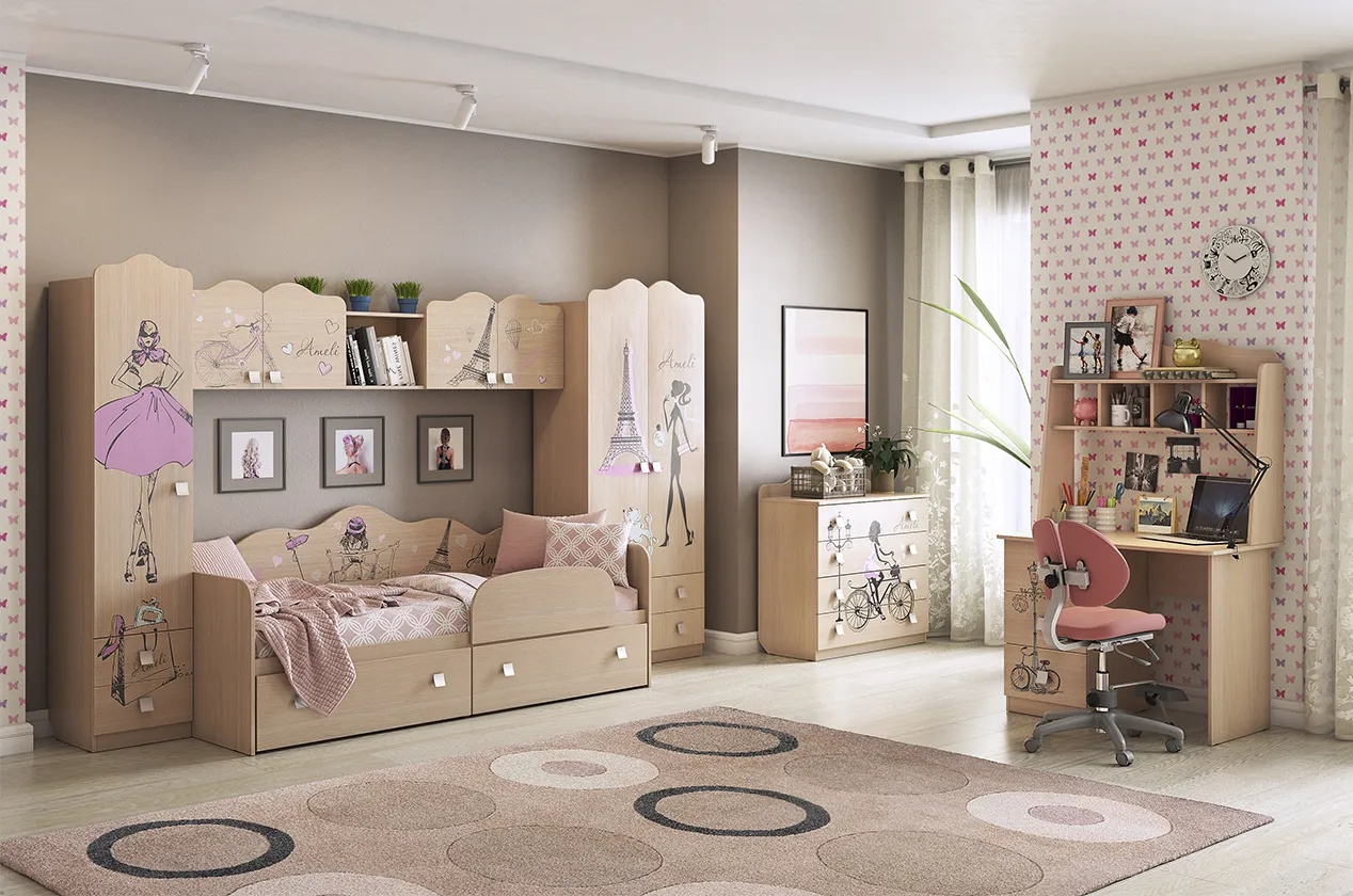 Детская мебель Амели отлично подойдет для девочек любого возраста. Корпус и фасады выполнены из ЛДСП, фасады декорированы фотопечатью.