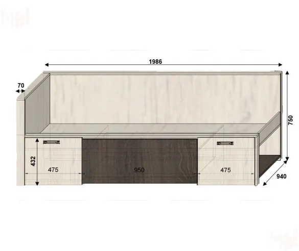 Кровать ФТ-03: 1986х750х940 мм. Спальное место 1900х800 мм.