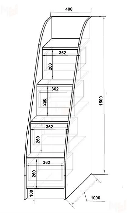- Тумба-лестница ПР-13/8 для подъема и спуска. Данный модуль состоит из четырех ступеней и оборудован четырьмя ящиками для хранения.