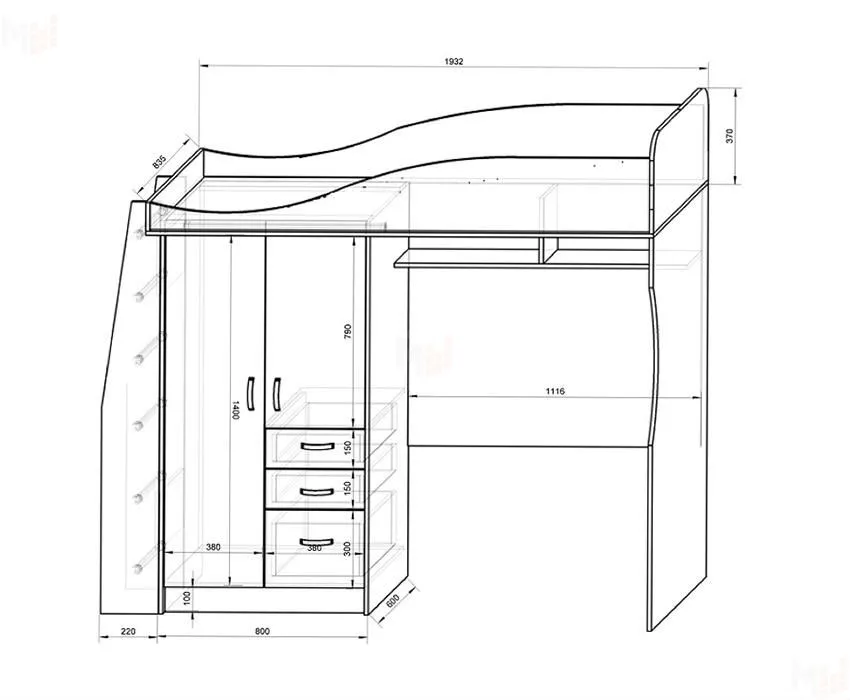 - Кровать-чердак ПР-4/1 со спальным местом 1900х800 мм. Основание - лист ДСП. Встроенный двухдверный шкаф заполнен выдвижными ящиками и металлической штангой. Под верхним ярусом предусмотрена полка для книг.