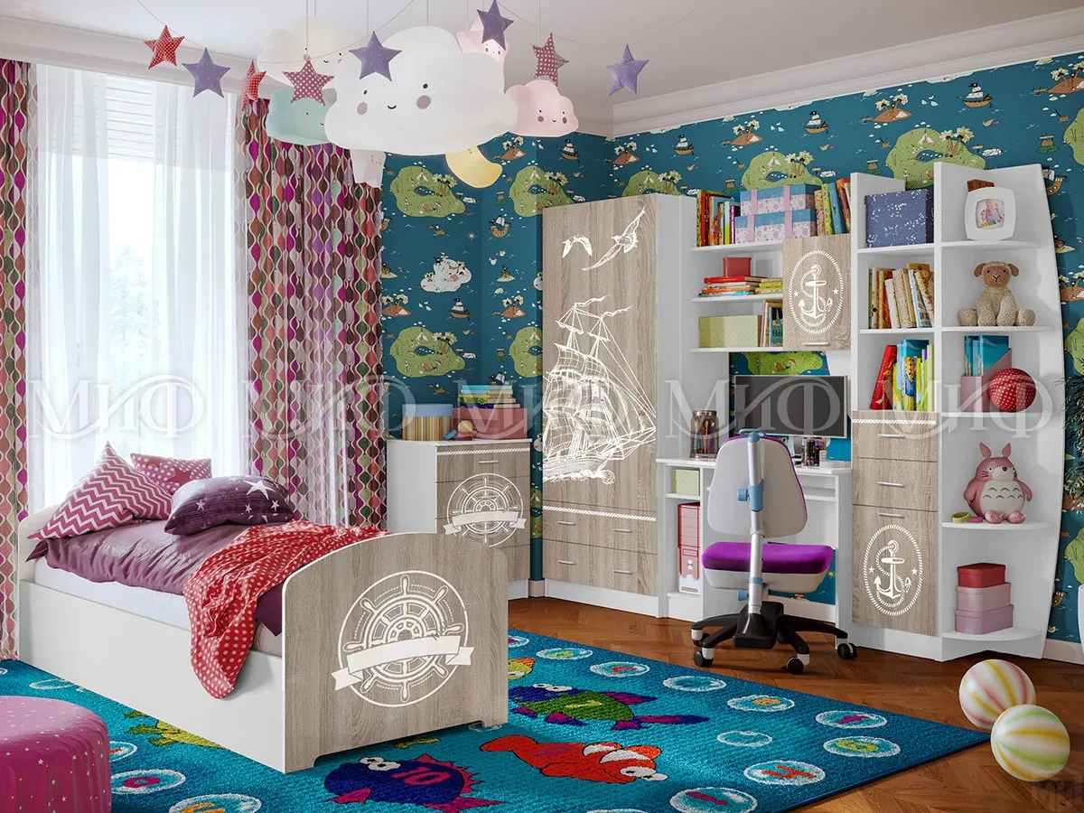 Юниор-2 Кровать ширина 840 мм, высота по спинке 650 мм, длина 2030. Размер спального места 80*200 см. Матрас приобретается дополнительно.Каркас мебели выполнен из ЛДСП Белый, фасады ЛДСП Дуб сонома с фотопечатью.