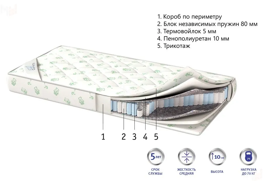 Характеристики: Cрок службы 6 лет Нагрузки до 70 кг на спальное место Высота 10 см Блок Pocket Spring