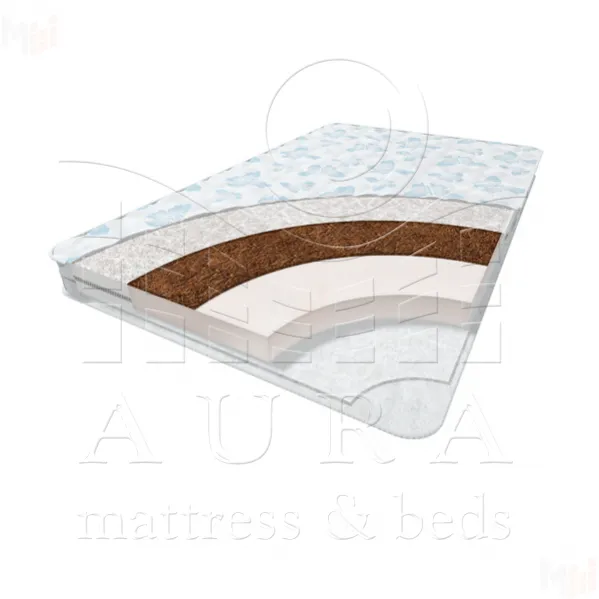 Ортопедический беспружинный матрас с различной жесткостью сторон: средней жесткости и мягкой, из холлофайбера (нетканого полотна нового поколения) и кокоса. Холлофайбер неаллергичен, что делает его безопасным для изготовления детских матрасов.