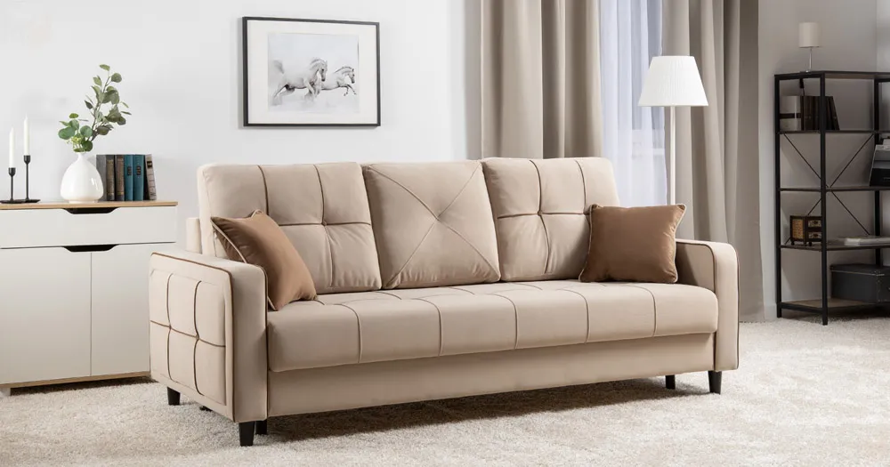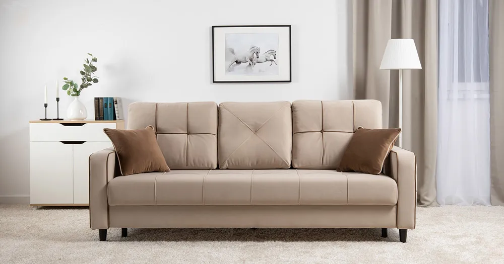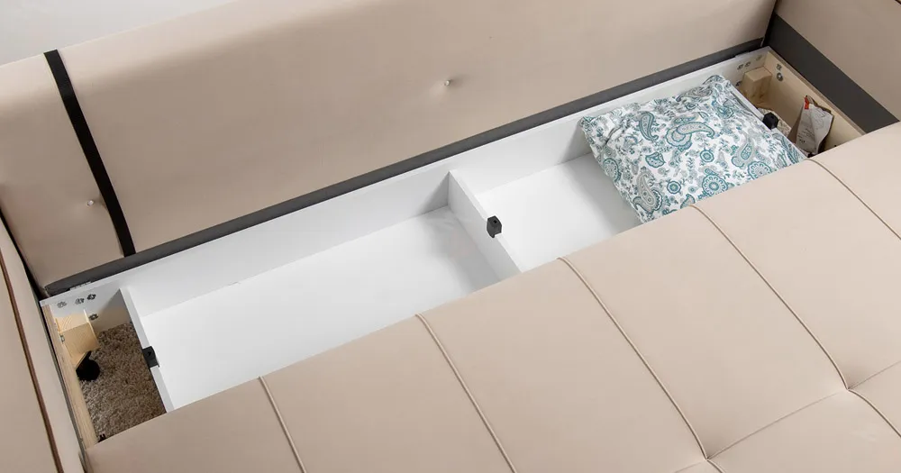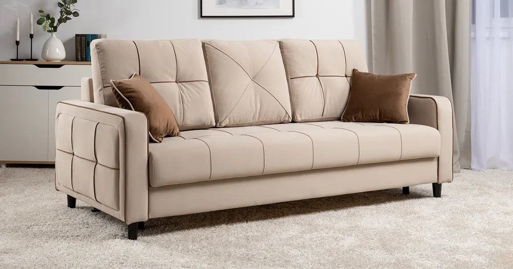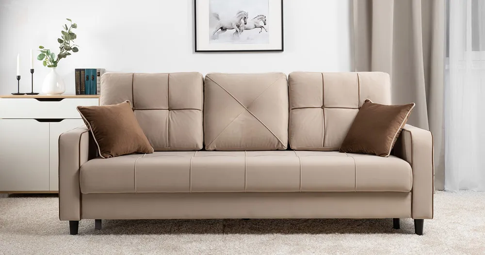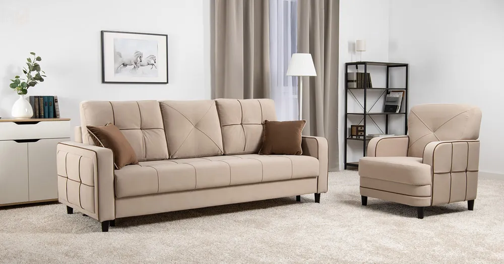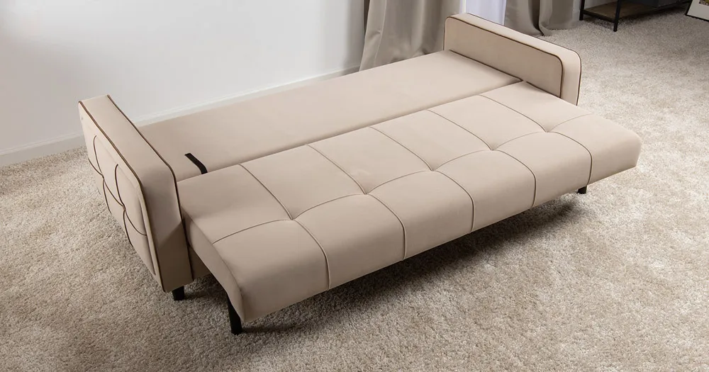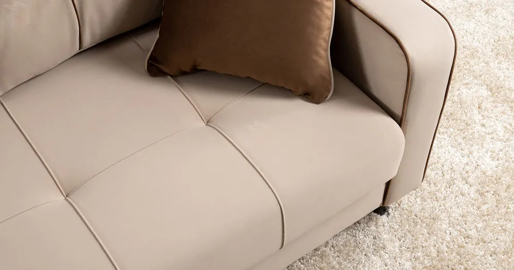 Декоративные канты на подушках и вставке подлокотников. Пуговицы в местах пересечения кантов на подушке и вставке подлокотников. По торцам подлокотников и думках контрастный декоративный кант. Защипы на сиденье и средней большой подушке.