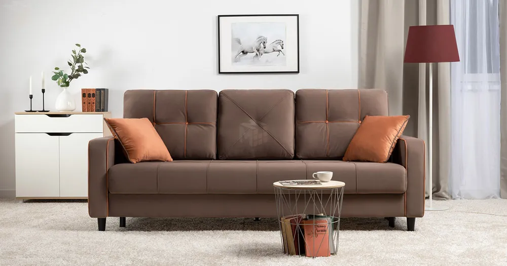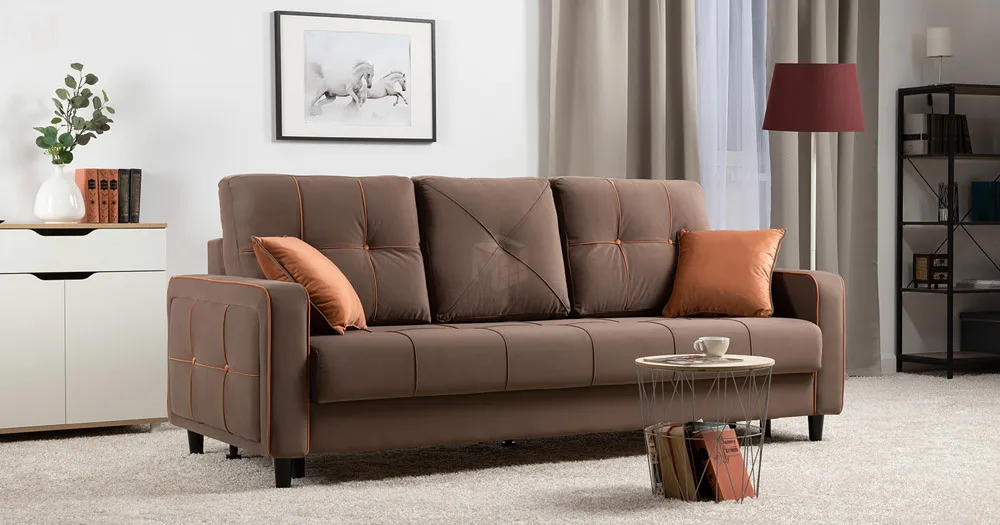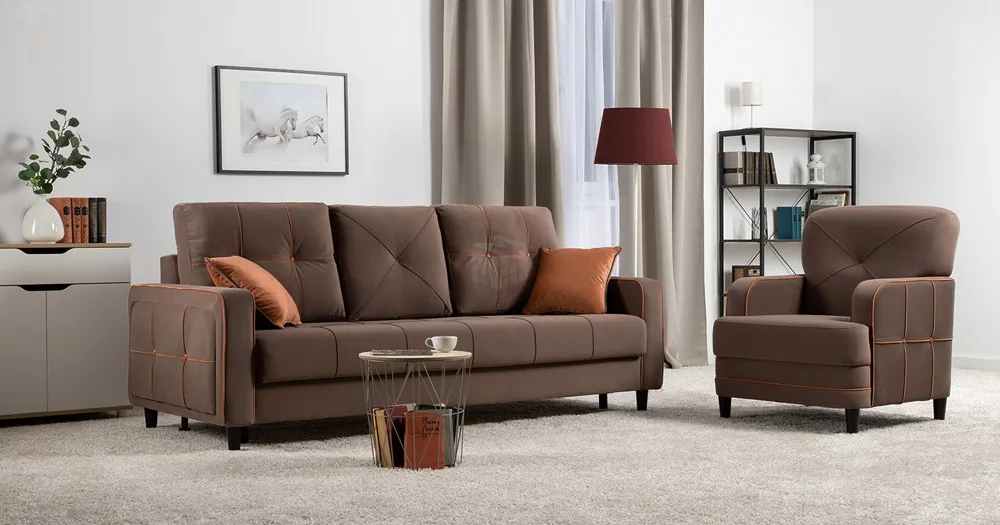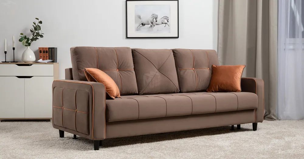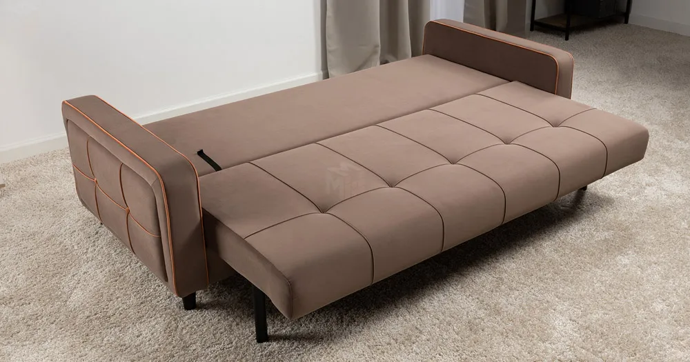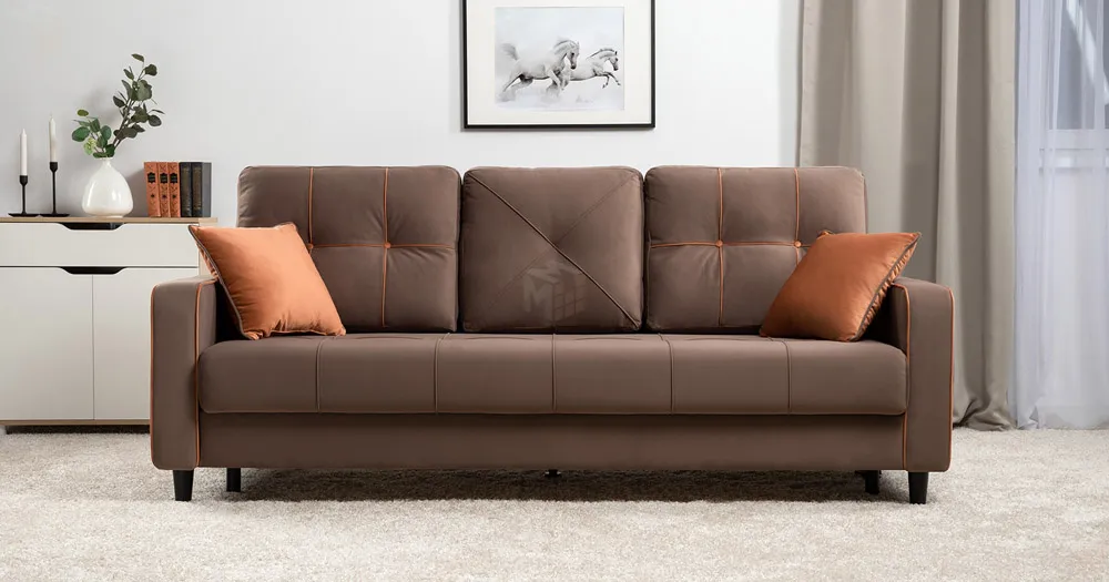 Декоративные канты на подушках и вставке подлокотников. Пуговицы в местах пересечения кантов на подушке и вставке подлокотников. По торцам подлокотников и думках контрастный декоративный кант. Защипы на сиденье и средней большой подушке.