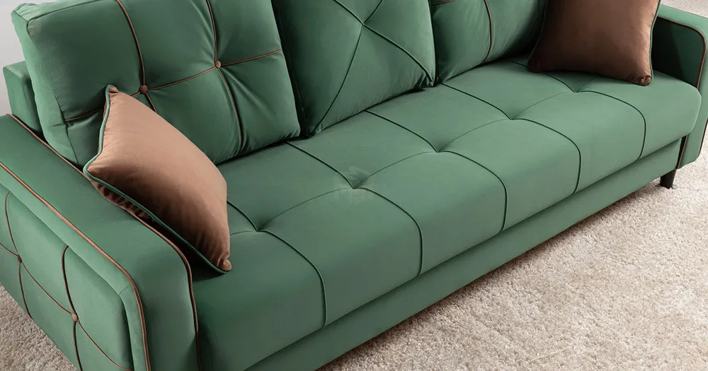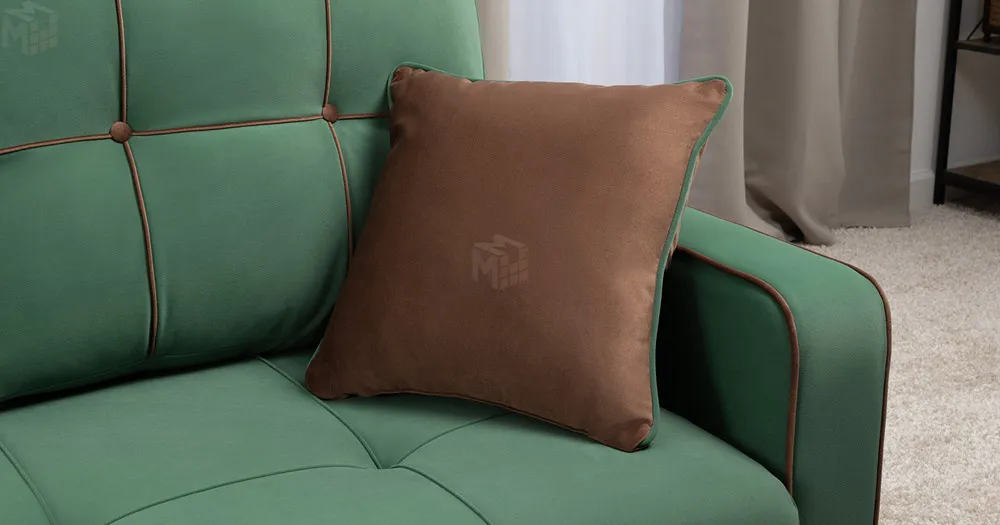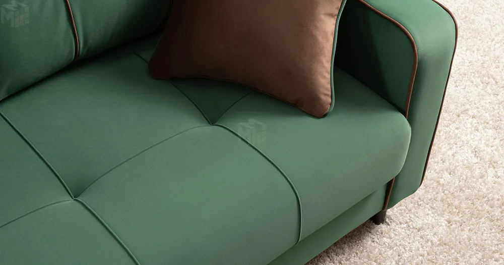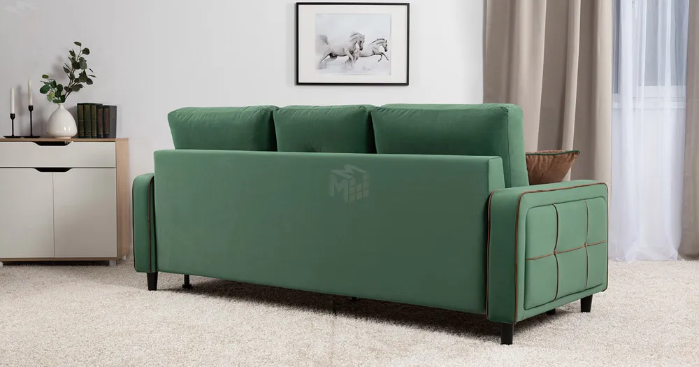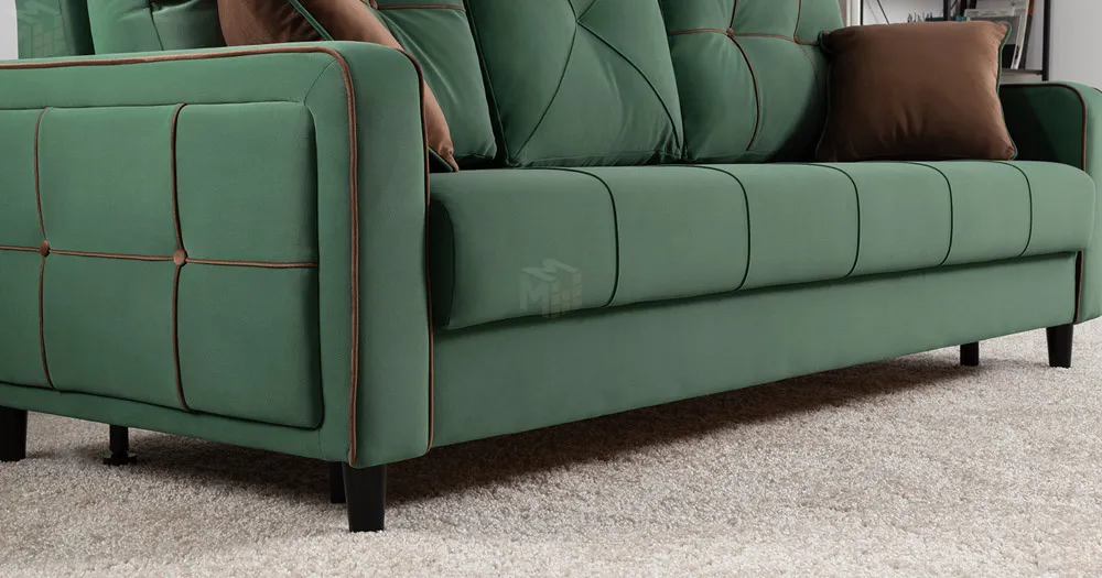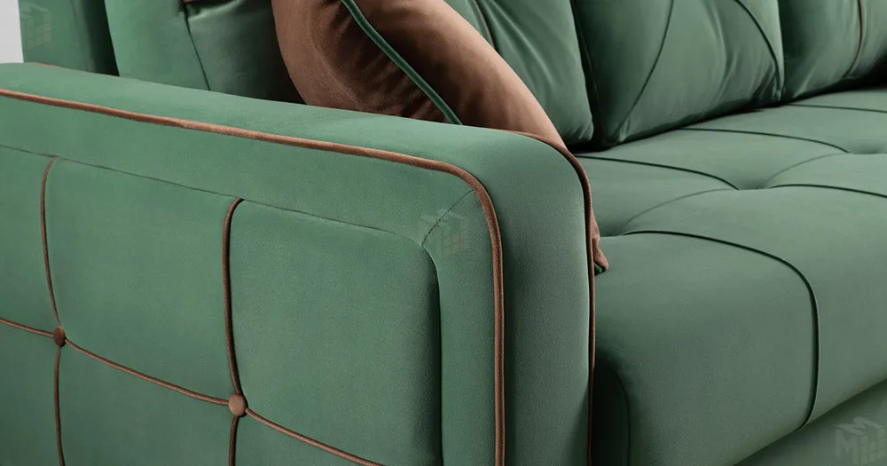 Декоративные канты на подушках и вставке подлокотников. Пуговицы в местах пересечения кантов на подушке и вставке подлокотников. По торцам подлокотников и думках контрастный декоративный кант. Защипы на сиденье и средней большой подушке.