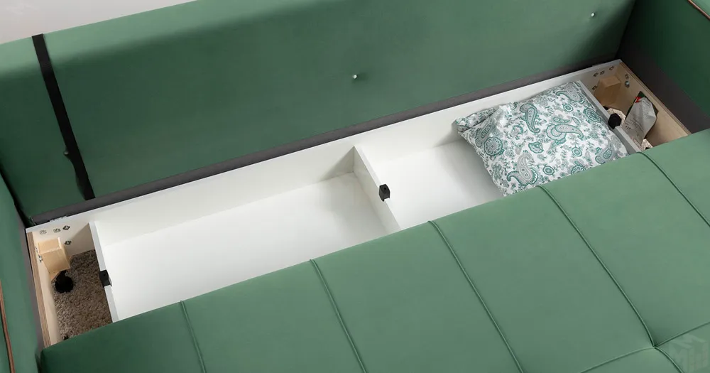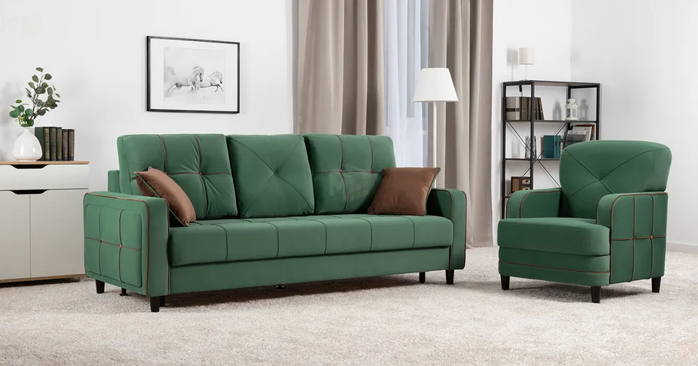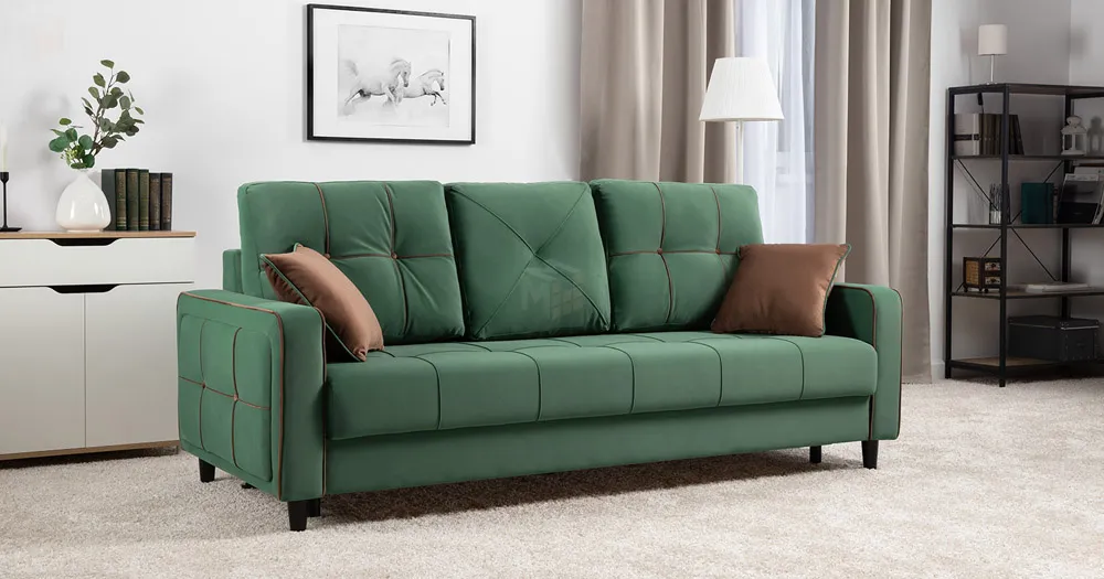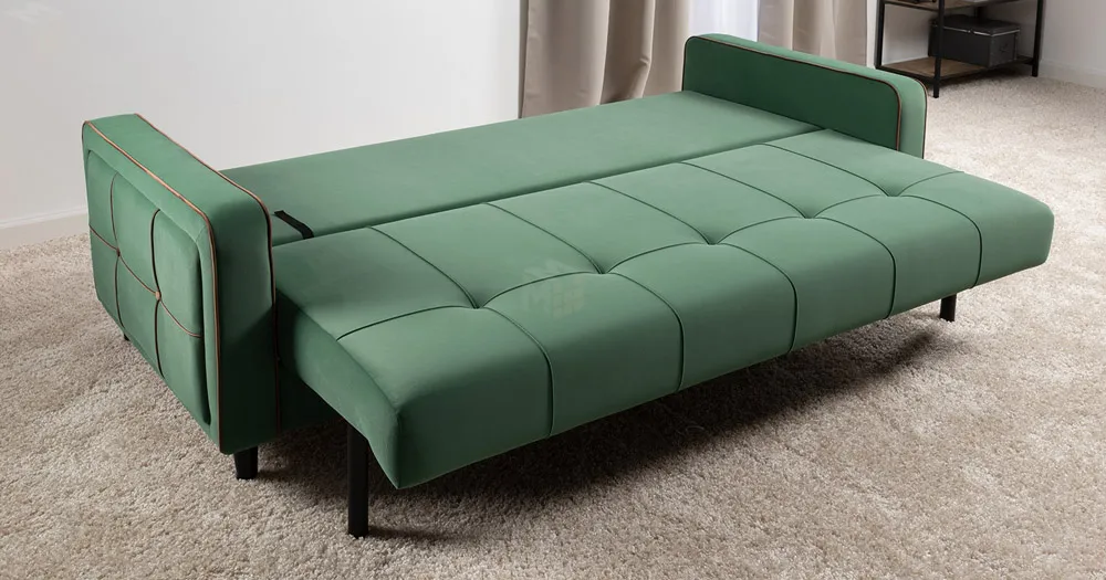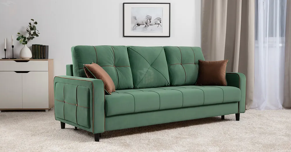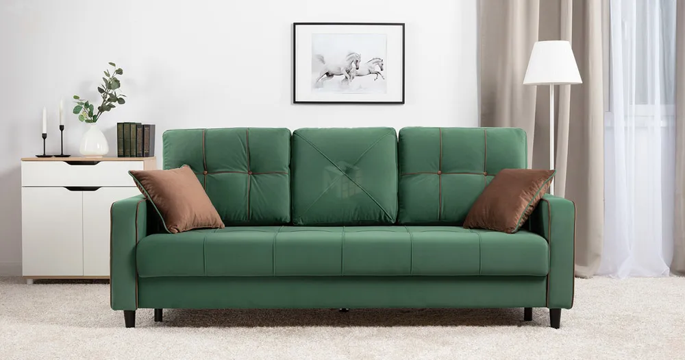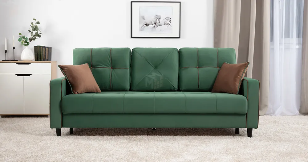 Декоративные канты на подушках и вставке подлокотников. Пуговицы в местах пересечения кантов на подушке и вставке подлокотников. По торцам подлокотников и думках контрастный декоративный кант. Защипы на сиденье и средней большой подушке.