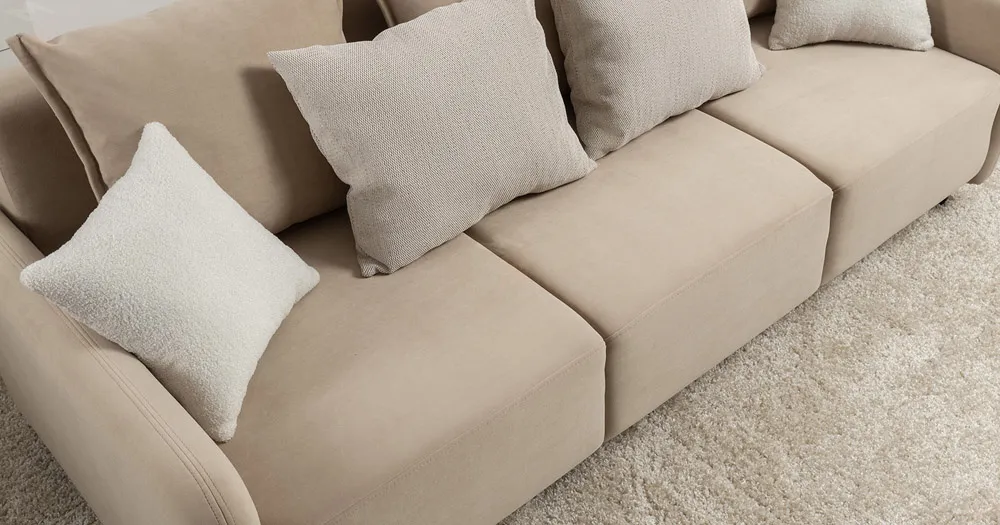 В комплекте 2 двусторонние декоративные подушки и 2 декоративные думки. Задняя спинка в ткани основы. Декоративные отделочные строчки по боковинам и сиденью