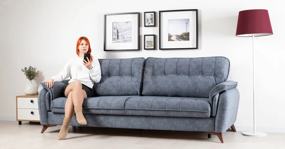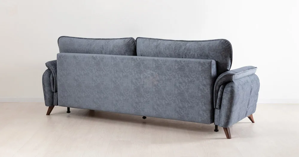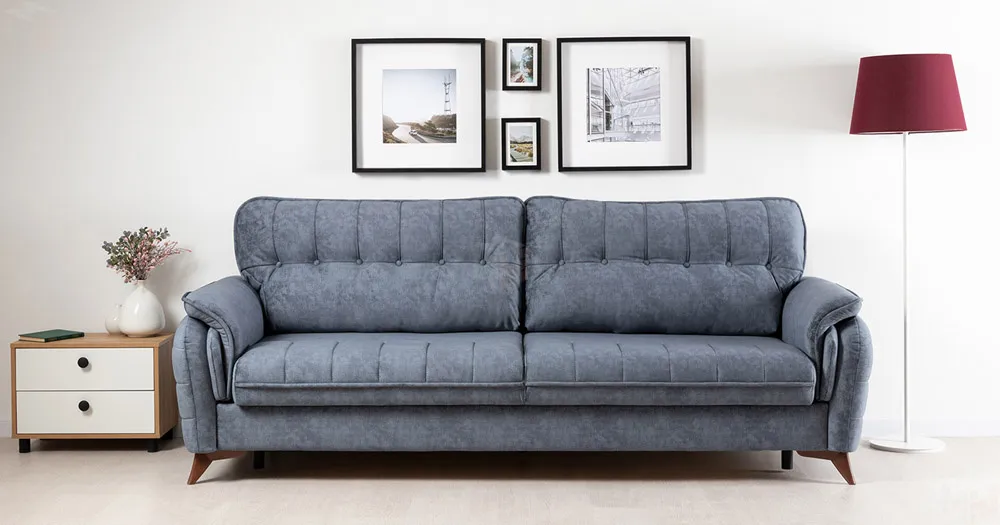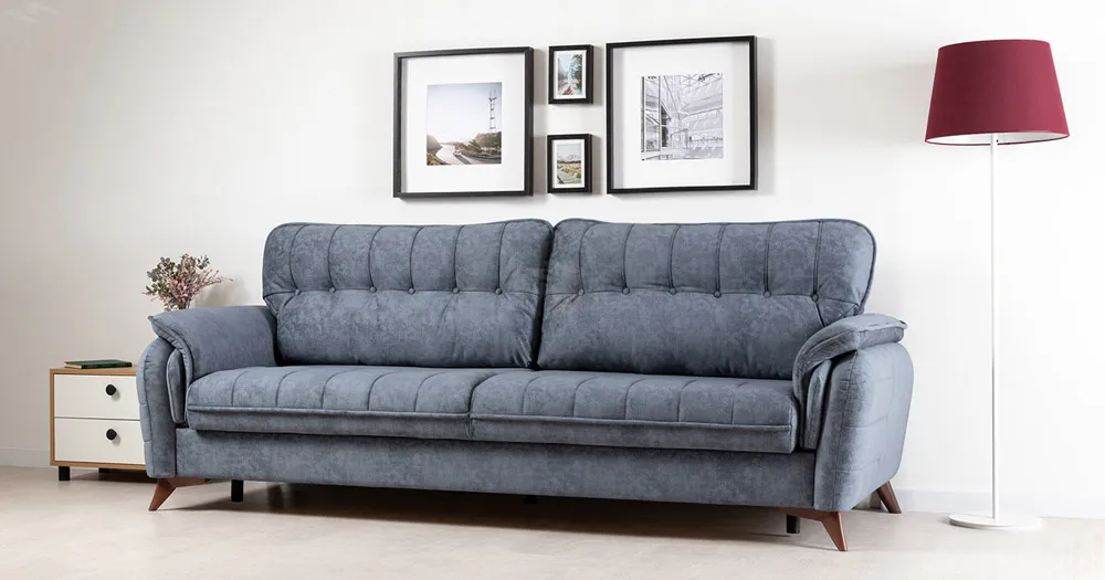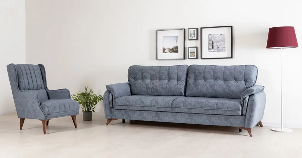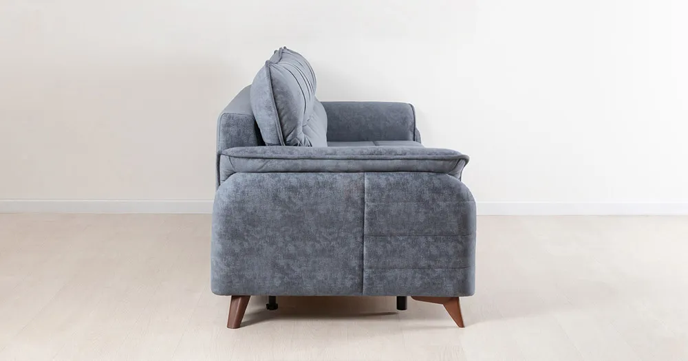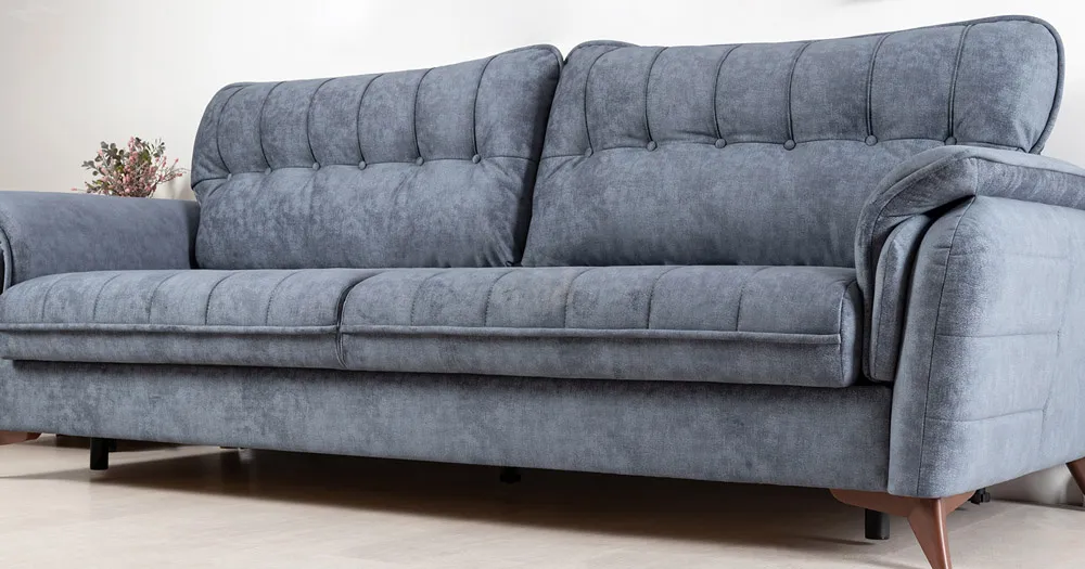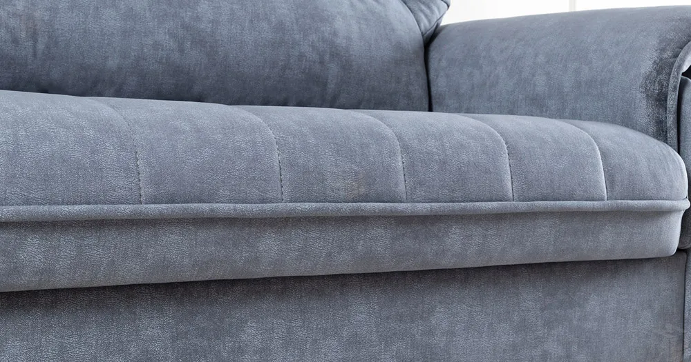 Декоративные канты на подушках дивана, подлокотниках и сиденье. Стежка на передней части сиденья и внешней части подлокотника. Защипы на верхней части подушки. Втяжки с пуговицами на приспинных подушках.