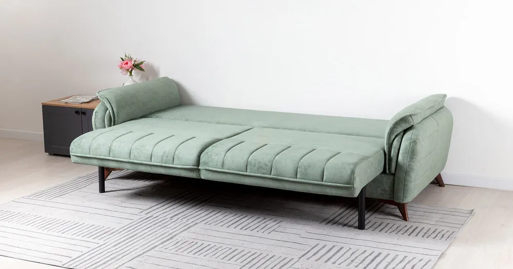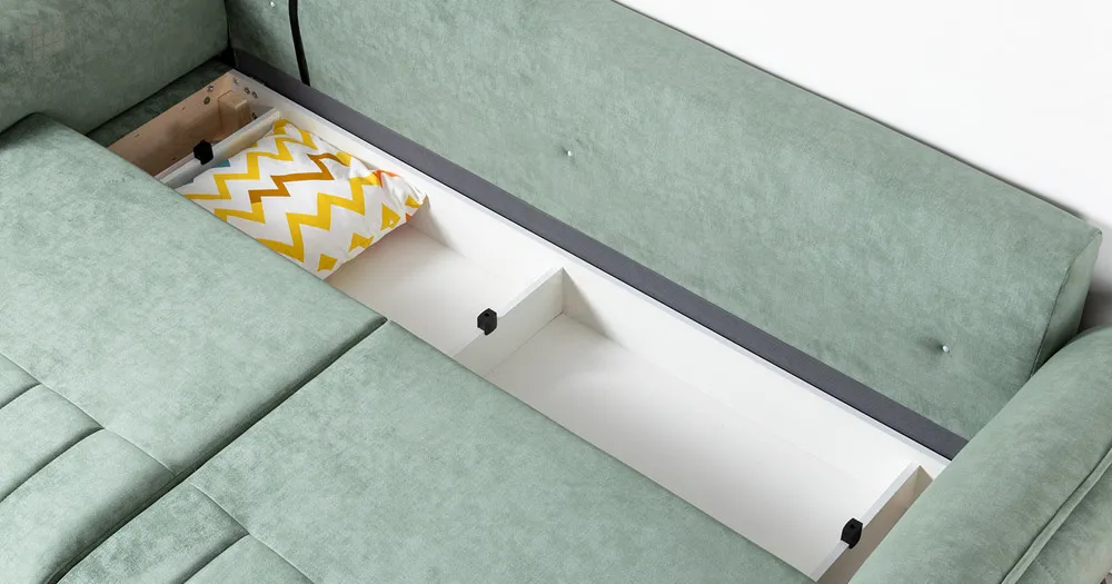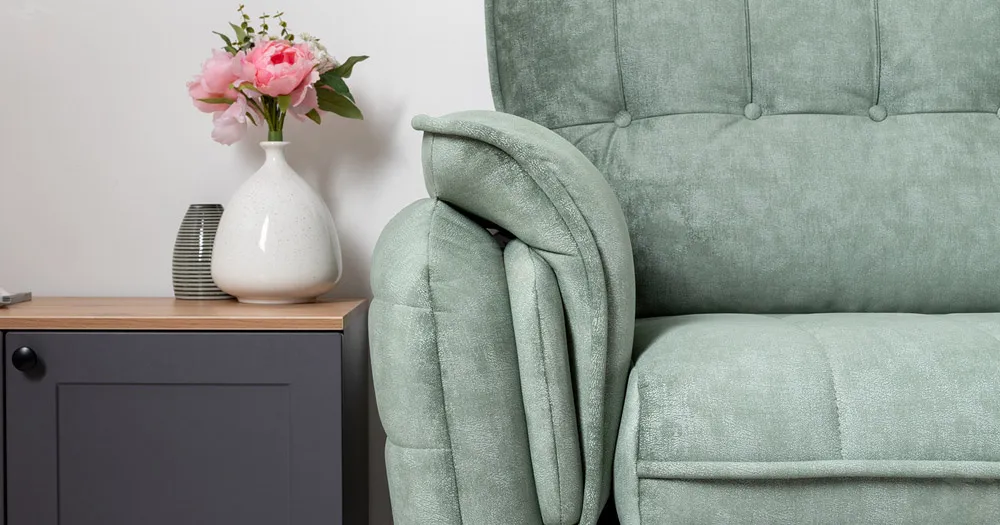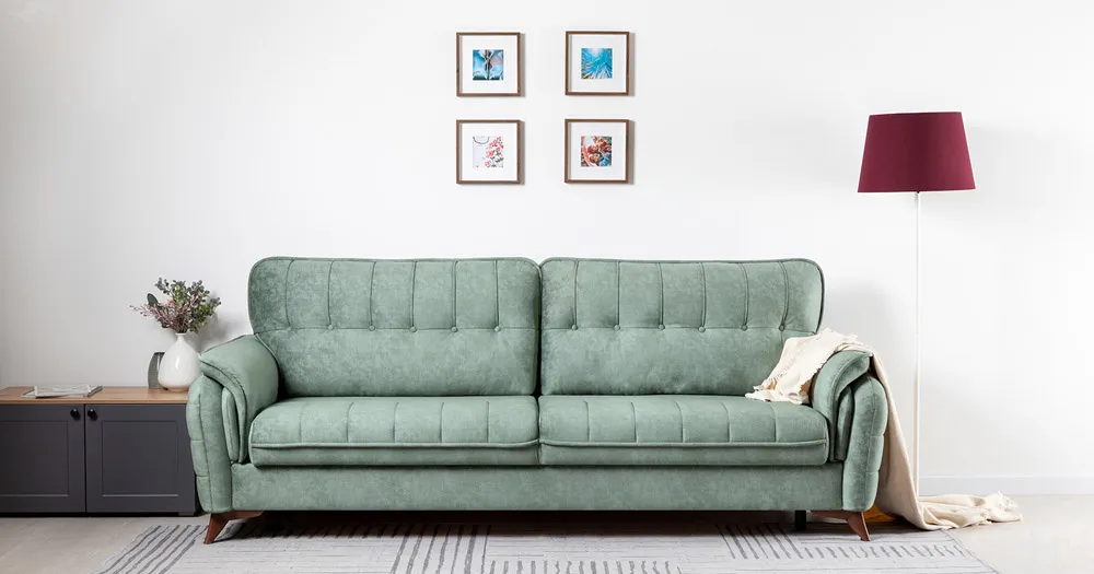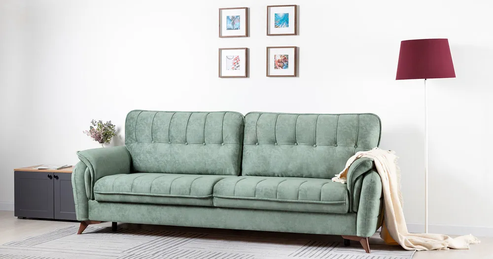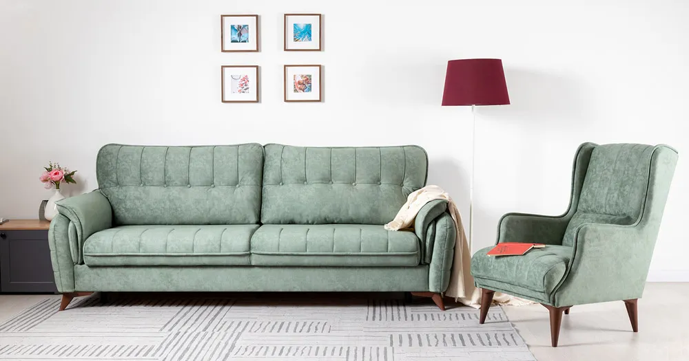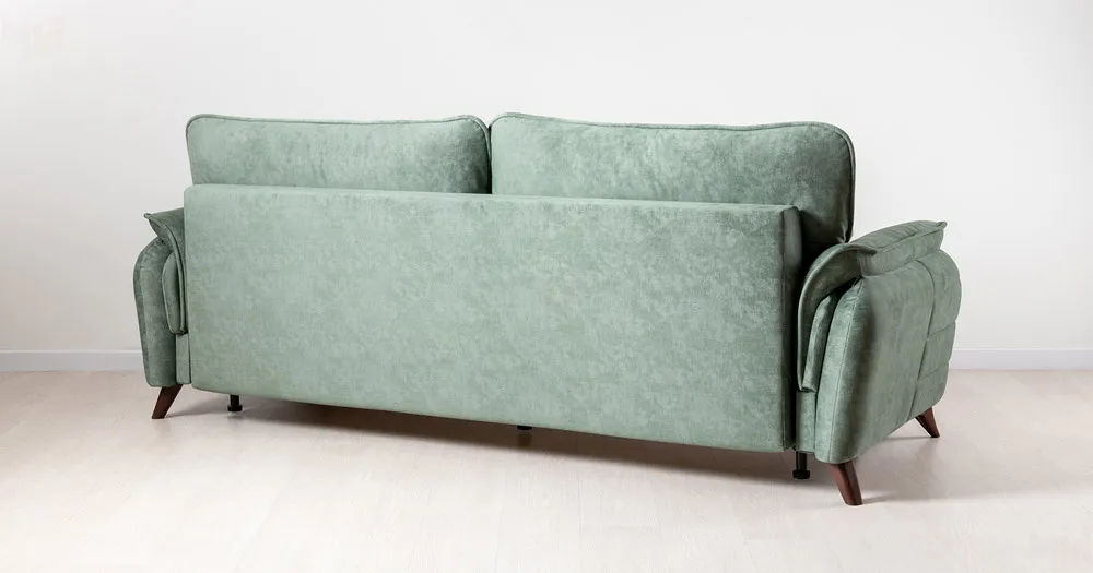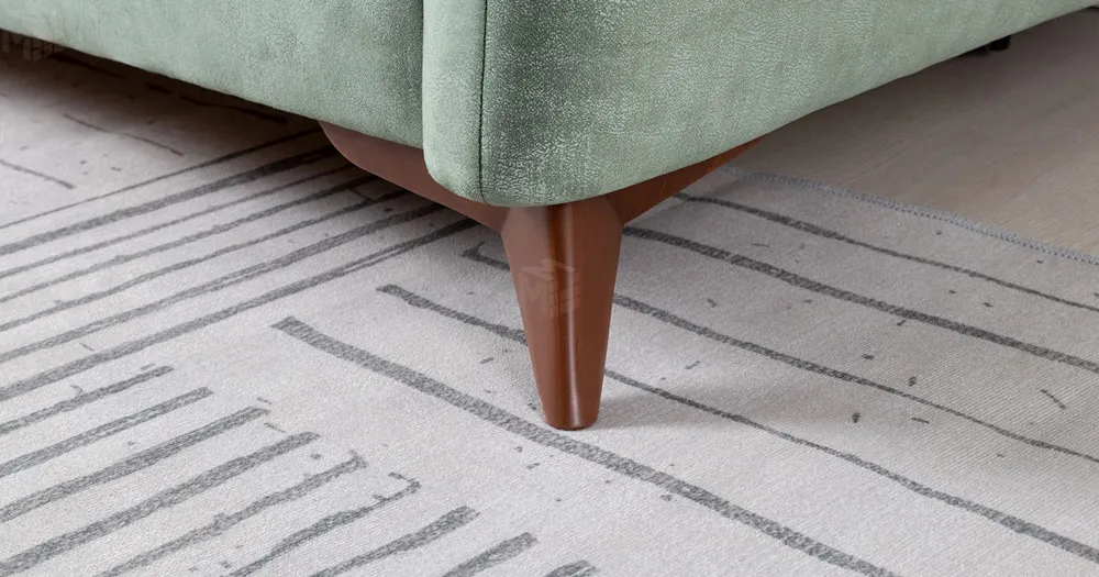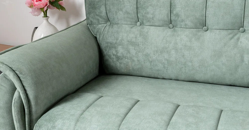 Декоративные канты на подушках дивана, подлокотниках и сиденье. Стежка на передней части сиденья и внешней части подлокотника. Защипы на верхней части подушки. Втяжки с пуговицами на приспинных подушках.