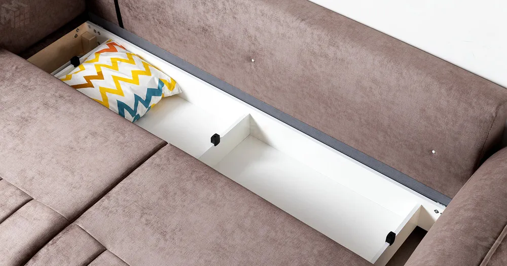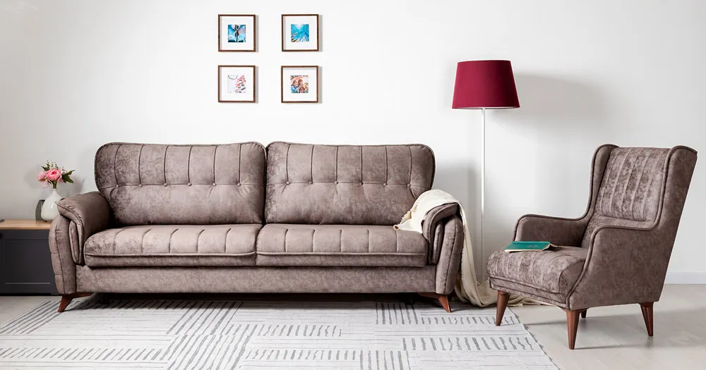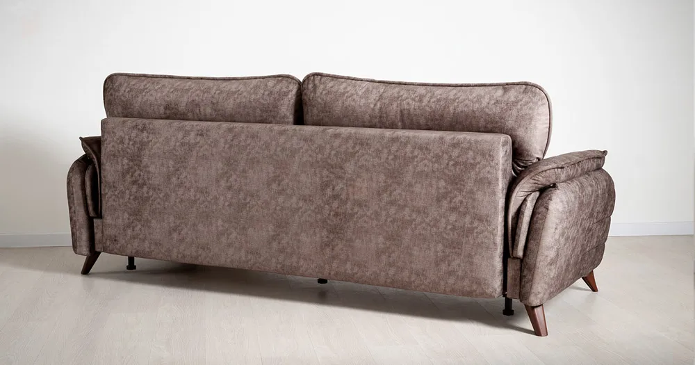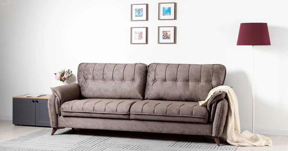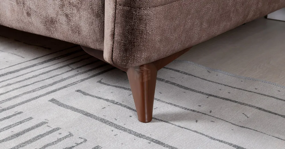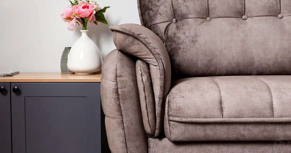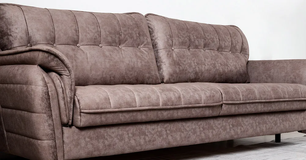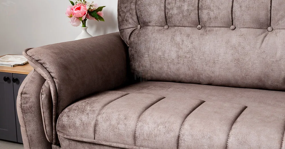 Декоративные канты на подушках дивана, подлокотниках и сиденье. Стежка на передней части сиденья и внешней части подлокотника. Защипы на верхней части подушки. Втяжки с пуговицами на приспинных подушках.