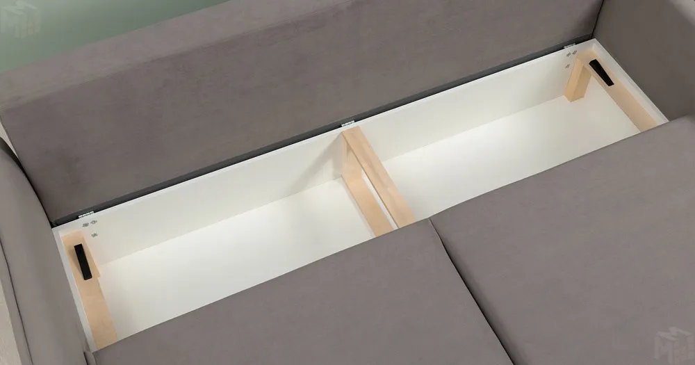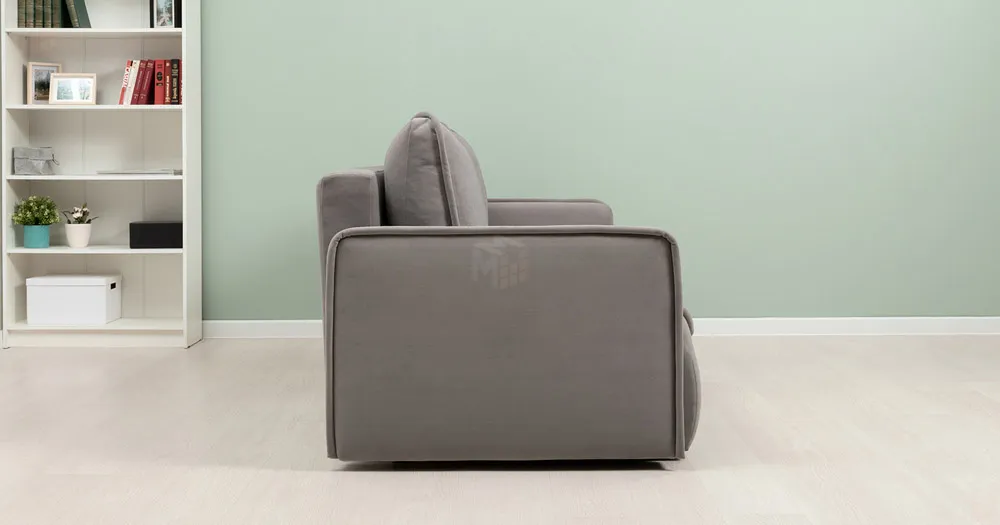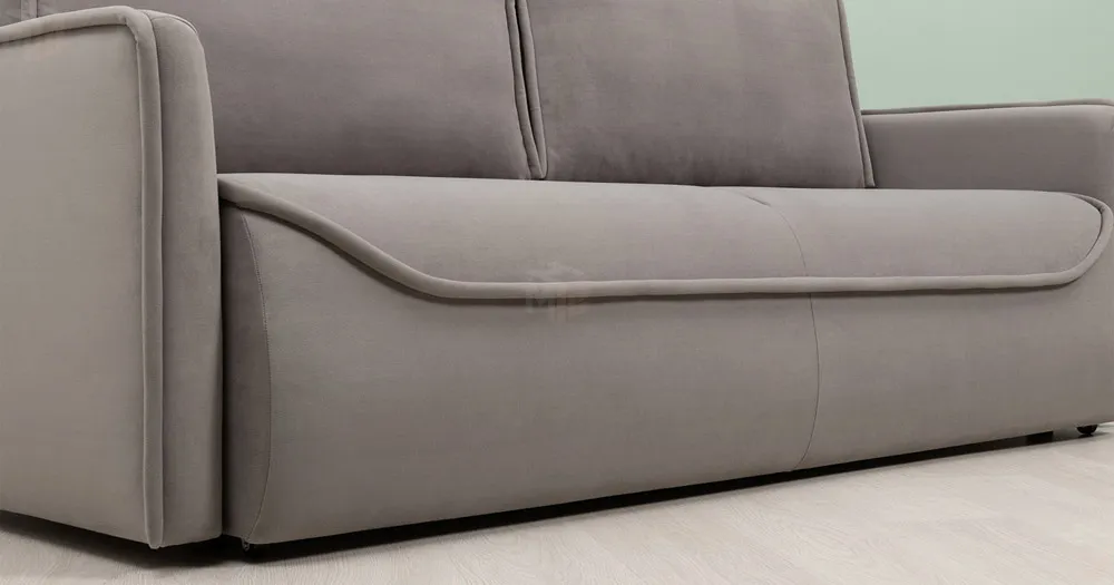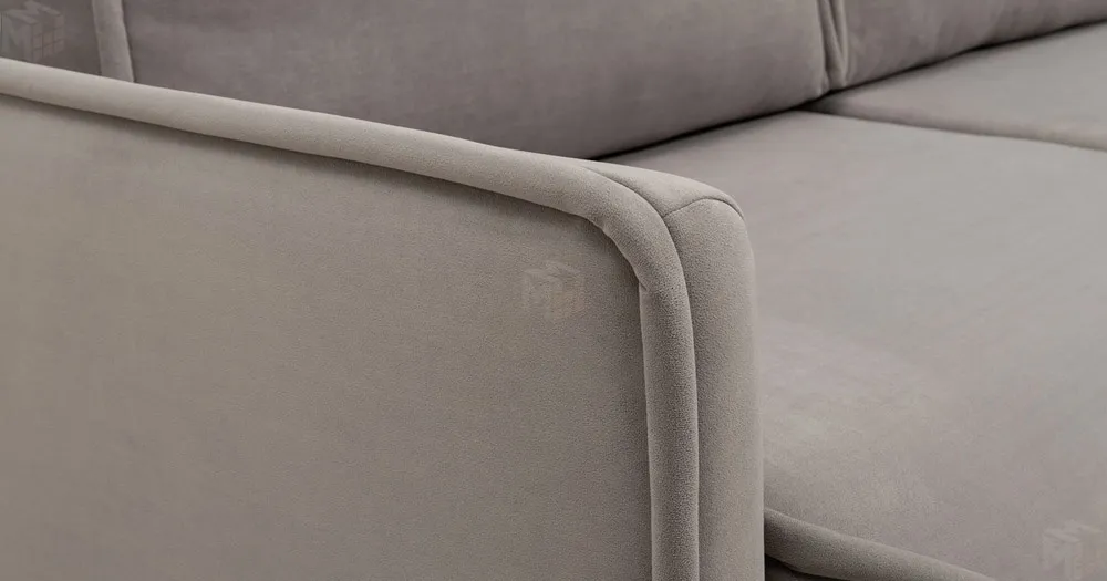 Кант на подушках заведен назад, с лицевой стороны по верху переходит на тыльную сторону. Выкатной блок целиковый, с лицевой стороны разделяется мягким выраженным кантом, переменного уровня примерно 240 мм от низа сидения. Подлокотники утонченные с кантом смещенным наружу. Кант по всему периметру подлокотника..