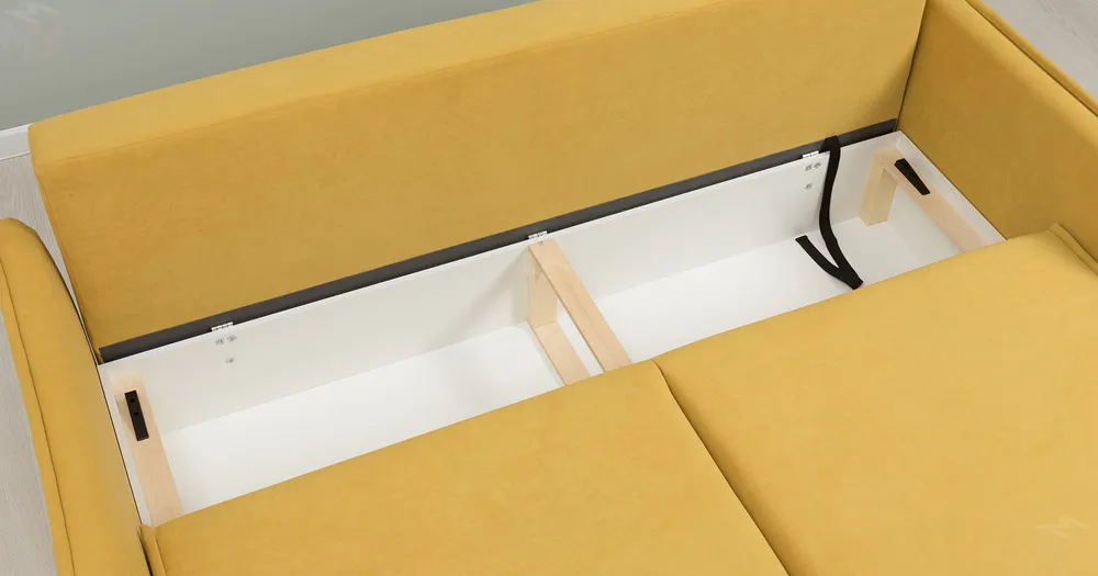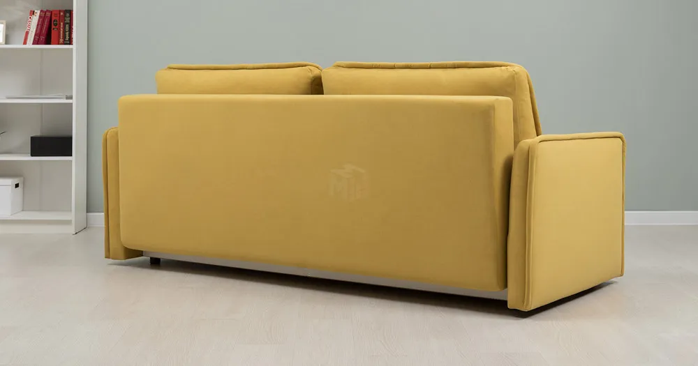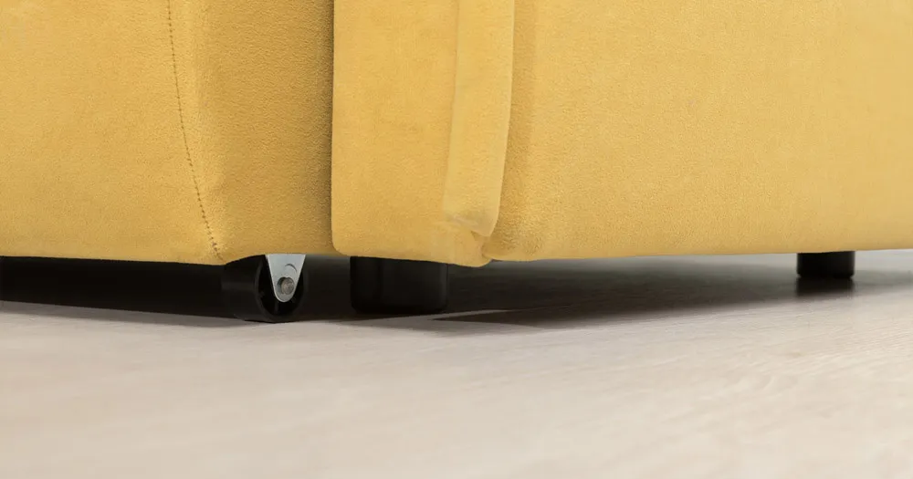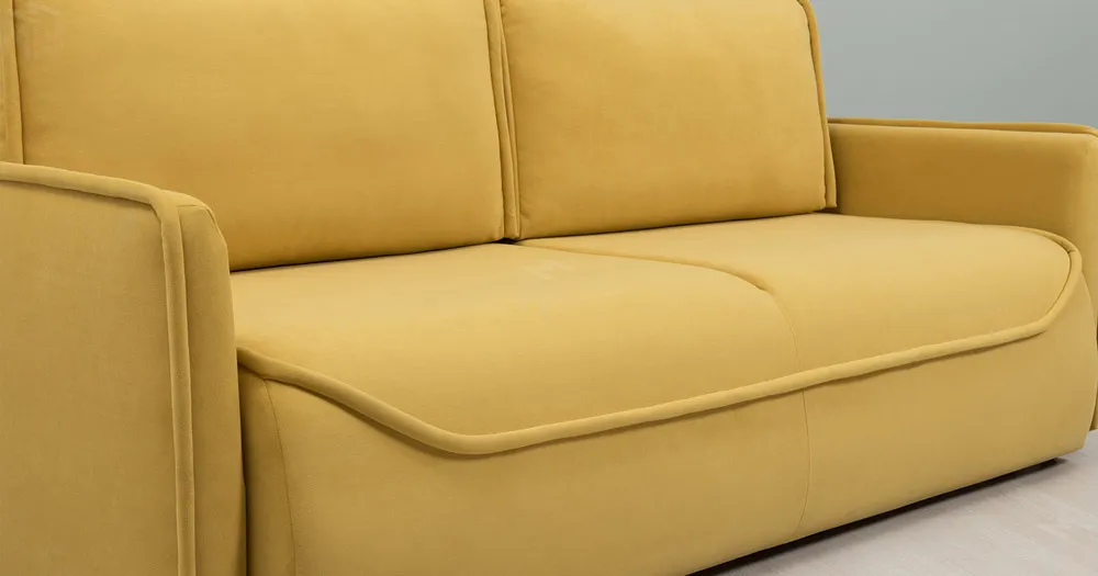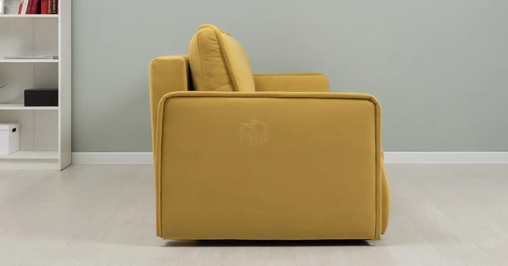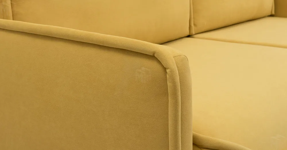 Кант на подушках заведен назад, с лицевой стороны по верху переходит на тыльную сторону. Выкатной блок целиковый, с лицевой стороны разделяется мягким выраженным кантом, переменного уровня примерно 240 мм от низа сидения. Подлокотники утонченные с кантом смещенным наружу. Кант по всему периметру подлокотника..
