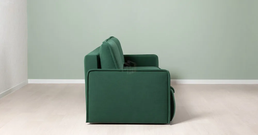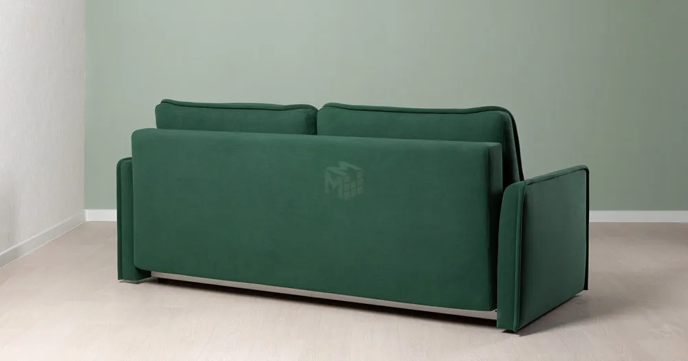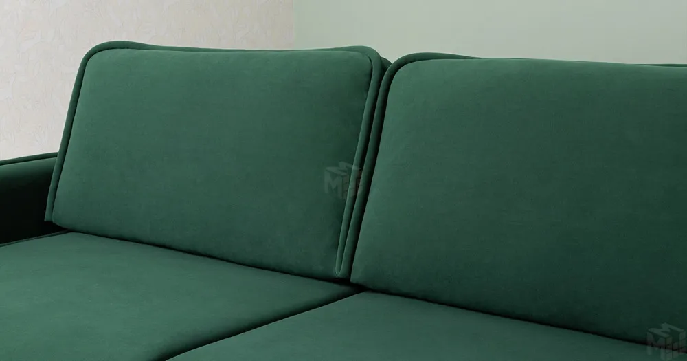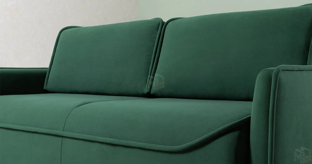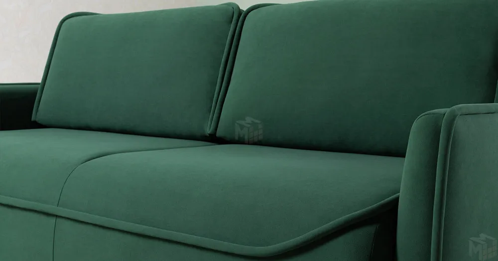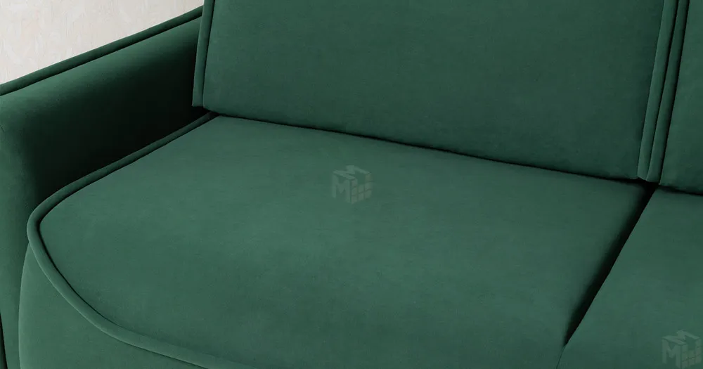 Кант на подушках заведен назад, с лицевой стороны по верху переходит на тыльную сторону. Выкатной блок целиковый, с лицевой стороны разделяется мягким выраженным кантом, переменного уровня примерно 240 мм от низа сидения. Подлокотники утонченные с кантом смещенным наружу. Кант по всему периметру подлокотника..