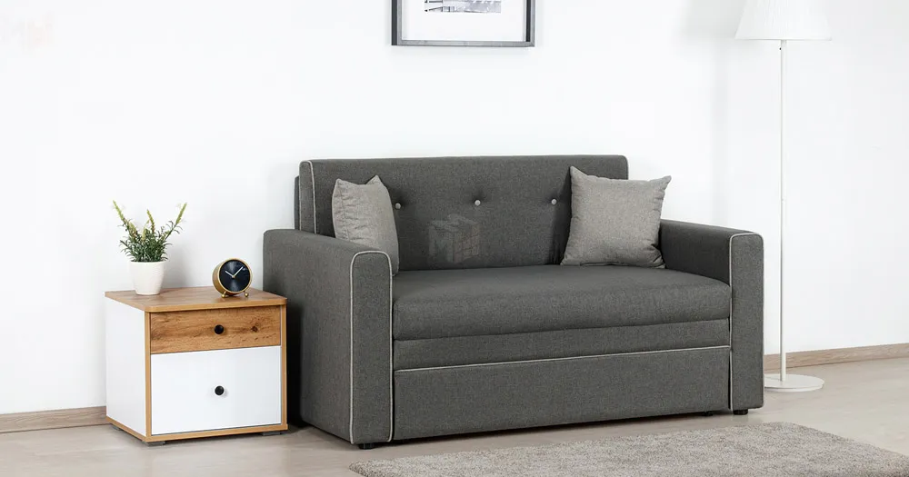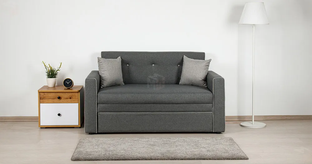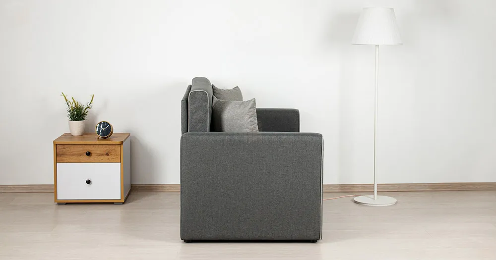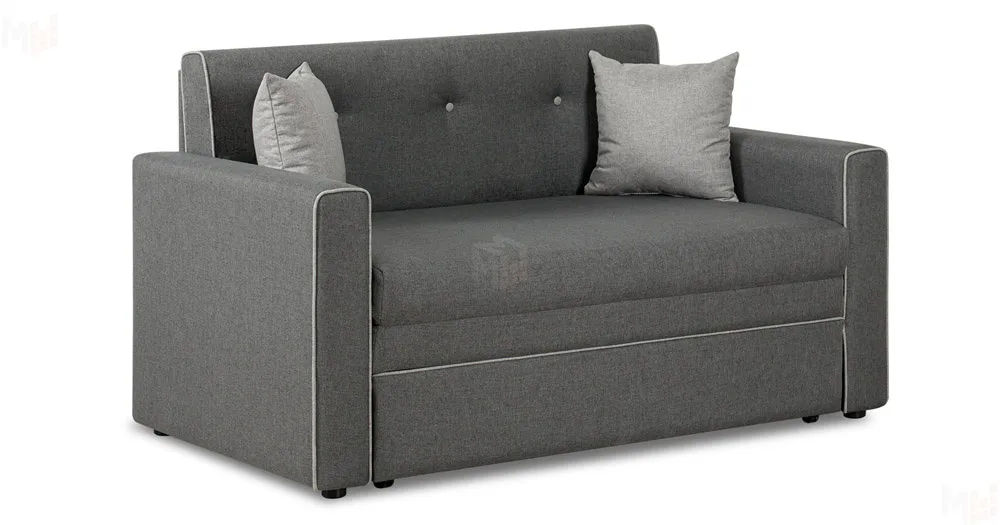 Декоративный контрастный кант по торцу спинки, торцу подлокотника, по верхнему срезу царги. Утяжки с пуговицами на спинке дивана. Две декоративные подушки в контрастной ткани.