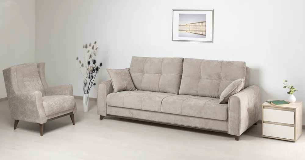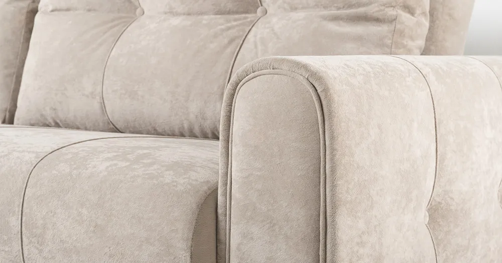 защипы на подушках и подлокотниках с утяжкой на 2 пуговицы из осн. материала, защипы на сидушке, декоративный кант на передних торцах подлокотников