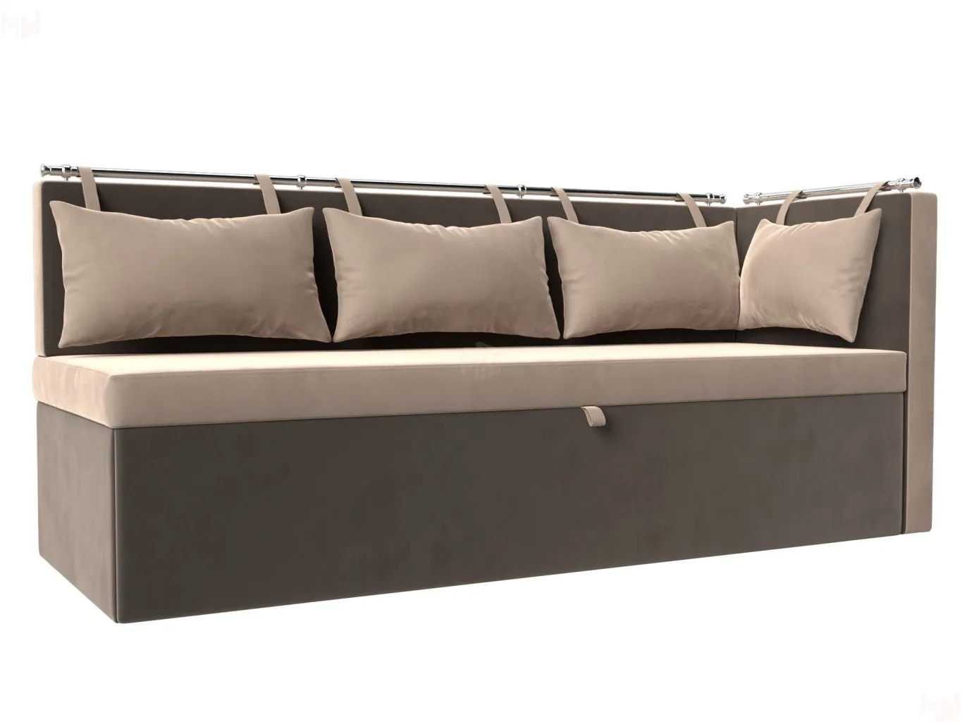 Метро – элегантный угловой диван с компактными параметрами. Для его размещения не потребуется много места. По дизайну схож со скамьей, дополненной небольшим углом. Обратите внимание на спинку, она украшена мягкими подушками с петельками, закрепленными на металлической трубе. Модель устойчива благодаря прочным пластиковым ножкам. -