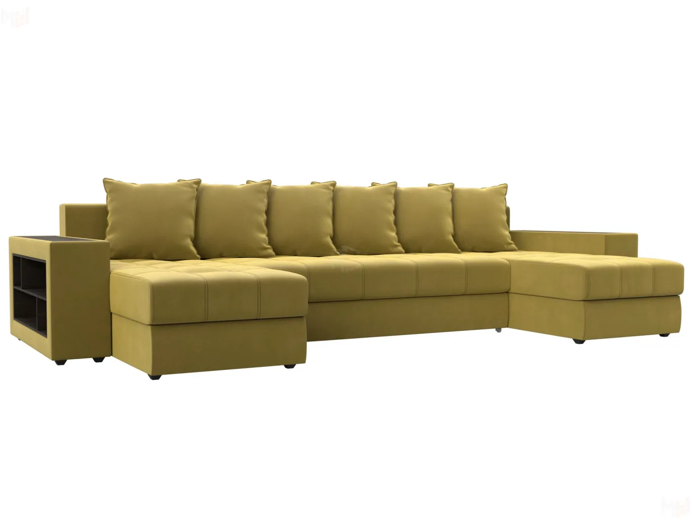 Большой п-образный диван Дубай универсален в использовании. Верх подлокотников – деревянные мини-столики. Сбоку имеются глубокие полочки для хранения предметов декора. Спинка состоит из 6 мягких подушек под цвет обивки. В диване предусмотрены вместительные ящики для белья. -