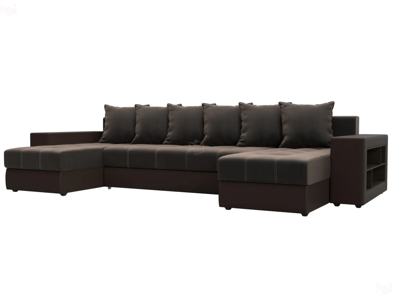 Большой п-образный диван Дубай универсален в использовании. Верх подлокотников – деревянные мини-столики. Сбоку имеются глубокие полочки для хранения предметов декора. Спинка состоит из 6 мягких подушек под цвет обивки.