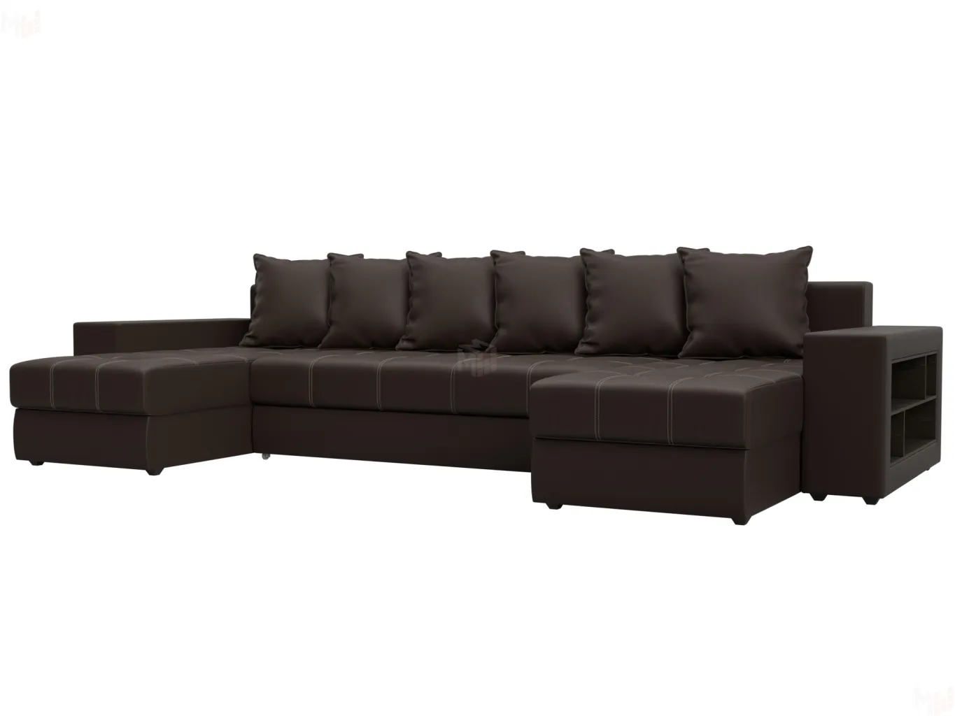Большой п-образный диван Дубай универсален в использовании. Верх подлокотников – деревянные мини-столики. Сбоку имеются глубокие полочки для хранения предметов декора. Спинка состоит из 6 мягких подушек под цвет обивки. В диване предусмотрены вместительные ящики для белья. -