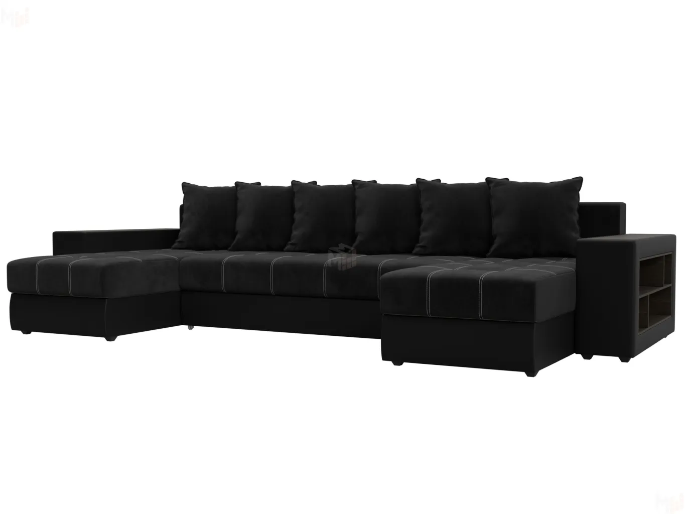Большой п-образный диван Дубай универсален в использовании. Верх подлокотников – деревянные мини-столики. Сбоку имеются глубокие полочки для хранения предметов декора. Спинка состоит из 6 мягких подушек под цвет обивки.