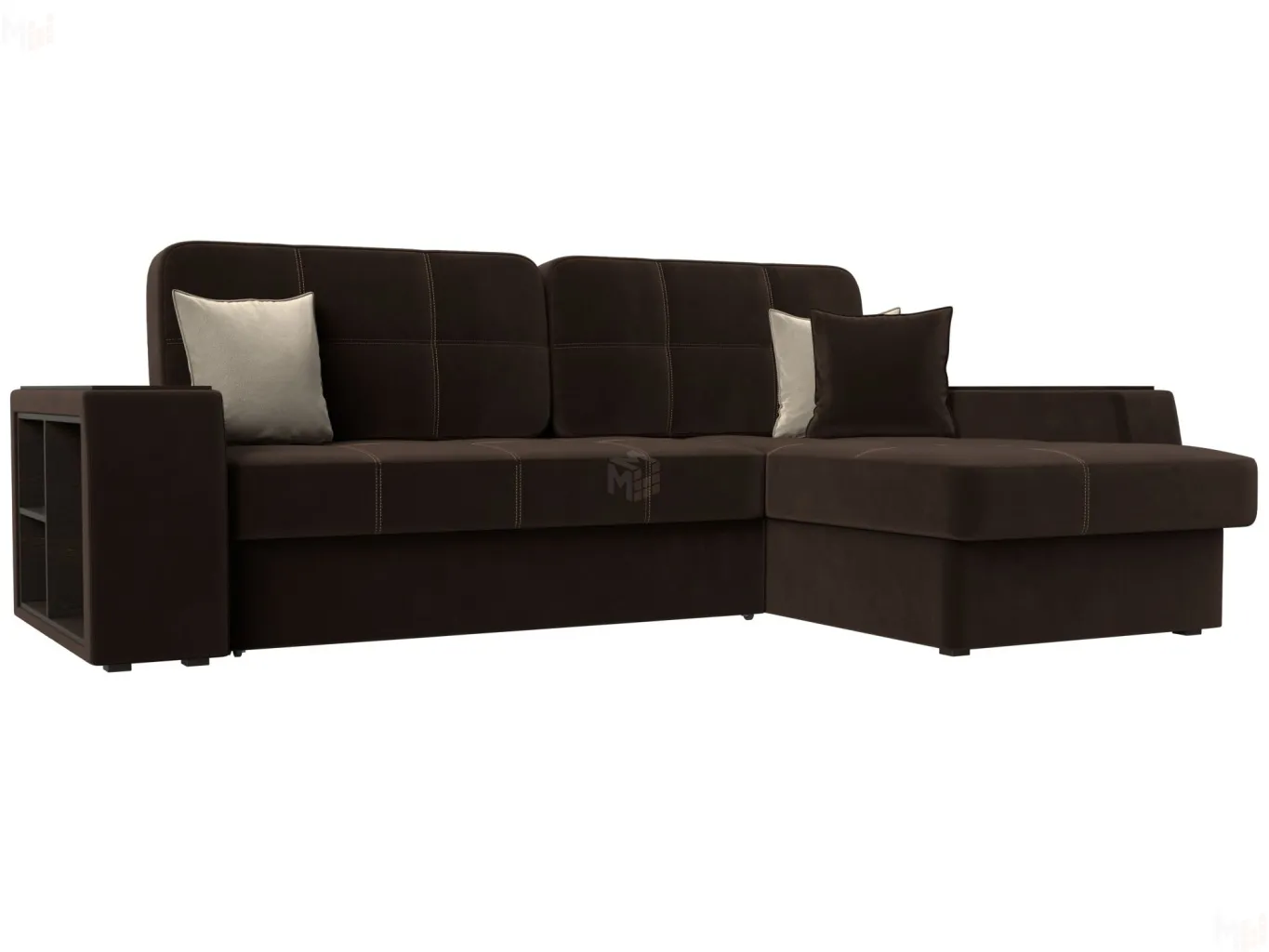 Шикарный угловой диван Брюссель удобен и функционален в использовании. Подлокотники выполняют роль мини-столиков. Одна из боковин дополнена книжными полками, декорированным «под дерево». Под длинной боковиной расположена ниша для белья. Изделие оснащено удобным механизмом трансформации в двуспальную кровать. -