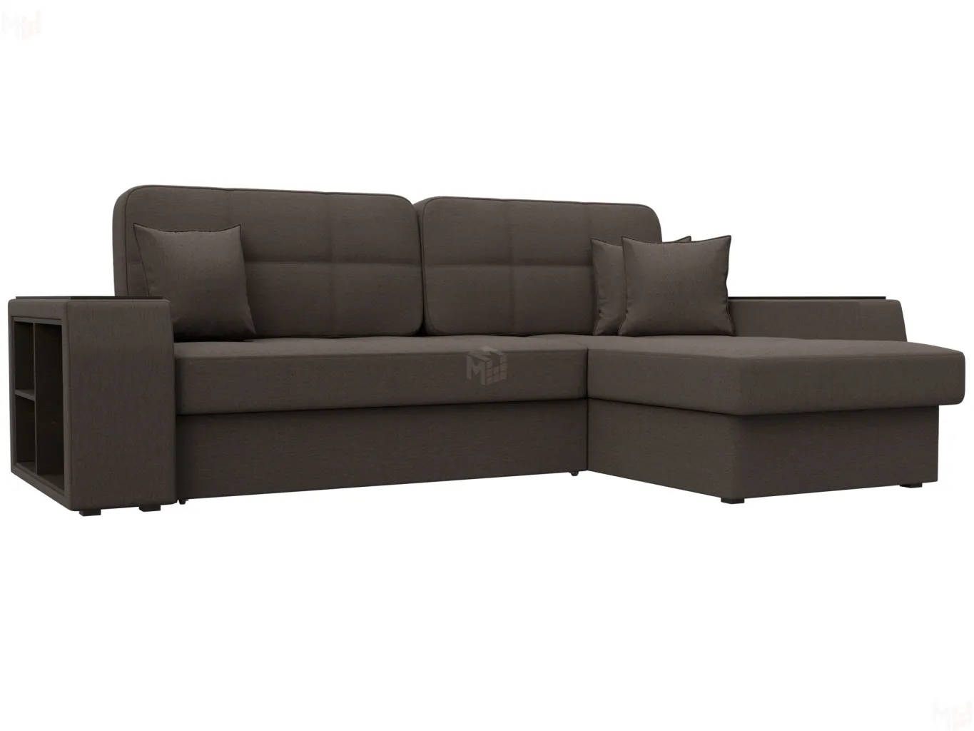 Шикарный угловой диван Брюссель удобен и функционален в использовании. Подлокотники выполняют роль мини-столиков. Одна из боковин дополнена книжными полками, декорированным «под дерево». Под длинной боковиной расположена ниша для белья. Изделие оснащено удобным механизмом трансформации в двуспальную кровать. -