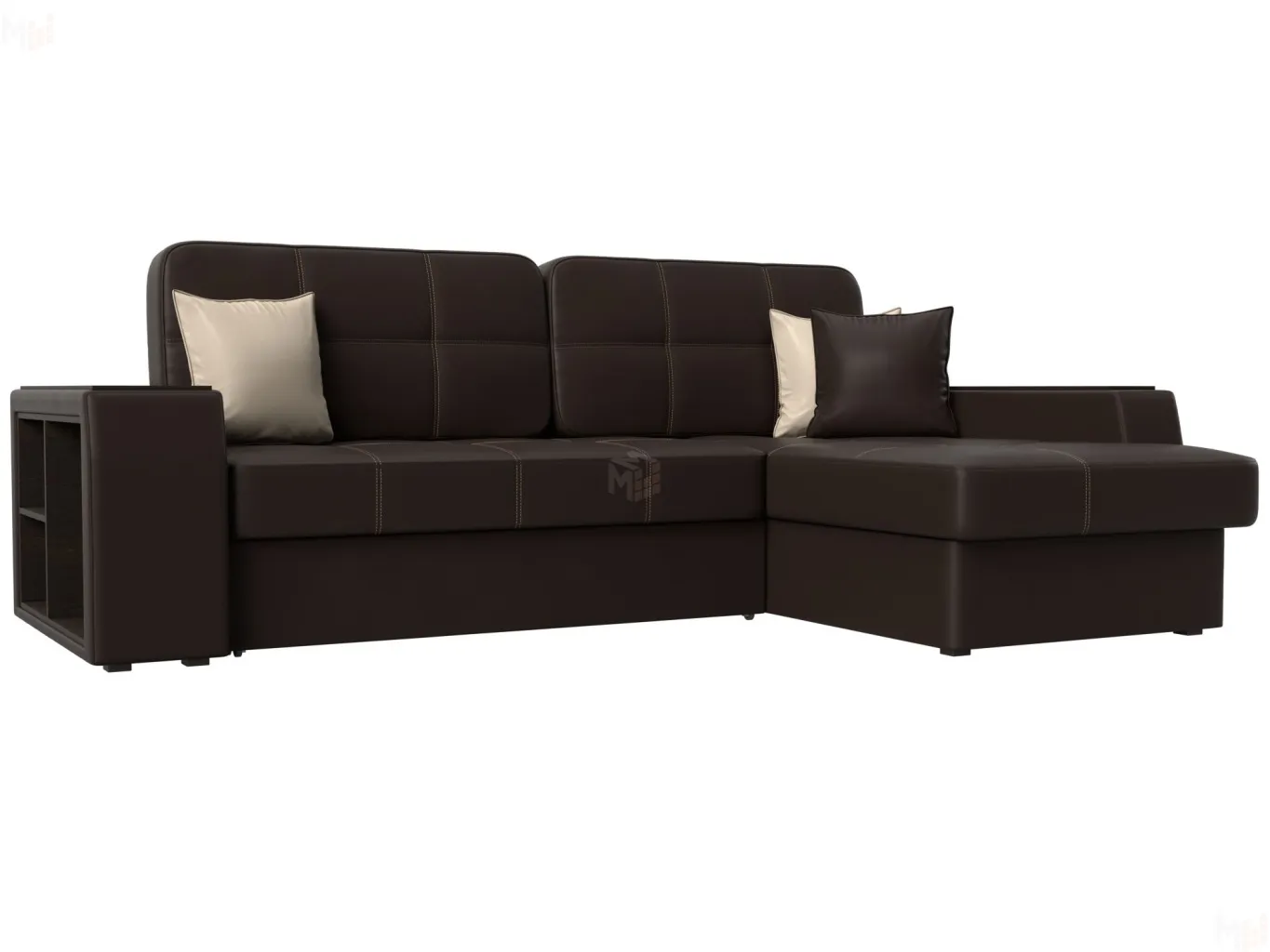 Шикарный угловой диван Брюссель удобен и функционален в использовании. Подлокотники выполняют роль мини-столиков. Одна из боковин дополнена книжными полками, декорированным «под дерево». Под длинной боковиной расположена ниша для белья. Изделие оснащено удобным механизмом трансформации в двуспальную кровать. -