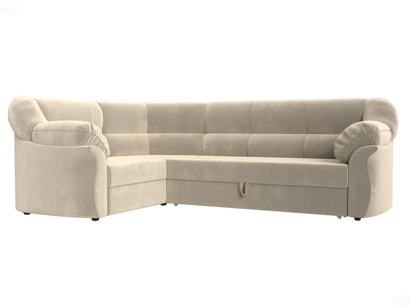 Карнелла – недорогой угловой диван, красивый снаружи и прочный внутри. Он устойчиво стоит на деревянных ножках, украшая своим присутствием гостиную. Спинка дивана украшена широкой каретной стяжкой. Угол можно расположить как справа, так и слева. Изделие легко раскладывается, образуя комфортное спальное место.