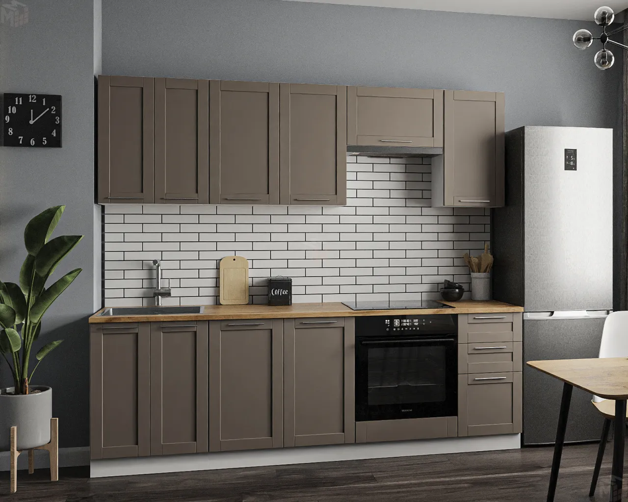 Кухонный гарнитур «Долан» максимально эффективно использует каждый миллиметр пространства. Долан представляет собой современный минималистичный дизайн. Такая кухня смотрится дорого: строгие формы, нет лишних деталей, вся техника гармонично встроена в гарнитур.Верхний модуль кухни «Долан» состоит из 3 шкафа для хранения кухонной утвари и 1 шкаф спроектирован под вытяжку, скрывает ее и не нарушает цельный дизайн кухни.Нижний модуль представлен 4 большими шкафами. Для хранения самой большой посуды и кухонной техники отводится самый просторный шкаф из двух секций. Секция со встроенной варочной панелью и духовым шкафом оснащена выдвижным ящиком для хранения. С правой стороны от этой секции расположен шкаф, который состоит из трёх ящиков на шариковых направляющих. Ящики выдвигаются полностью, открывая доступ ко всем вещам, которые в них находятся. У кухни предусмотрен шкаф со встроенной мойкой. Внутри шкафа есть место для хранения кухонной утвари, инвентаря или мусорного контейнера.