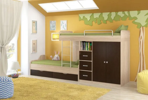 Кровать Дельта - 18.02.04 - это эргономичное, оригинальное спальное место, позволяющее значительным образом сэкономить место в детской комнате. Верхний ярус оборудован прочным ограждением для защиты от падений во время сна. Непосредственно под спальным местом есть вместительный шкаф, полки и ящики. Под второй, нижней кроватью, так же расположены два выдвижных ящика.
