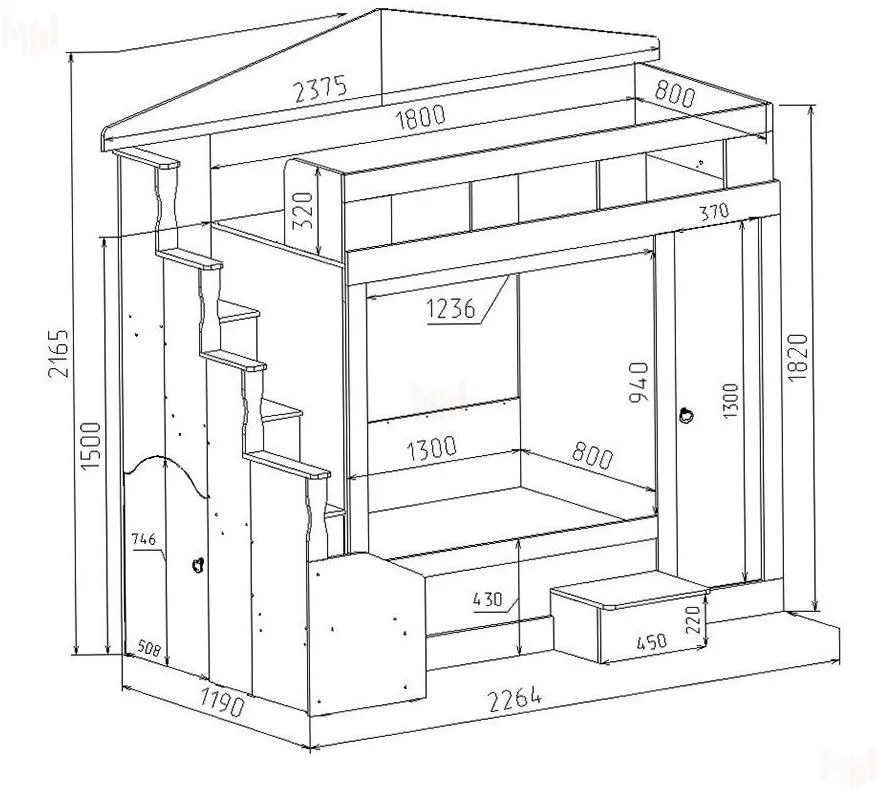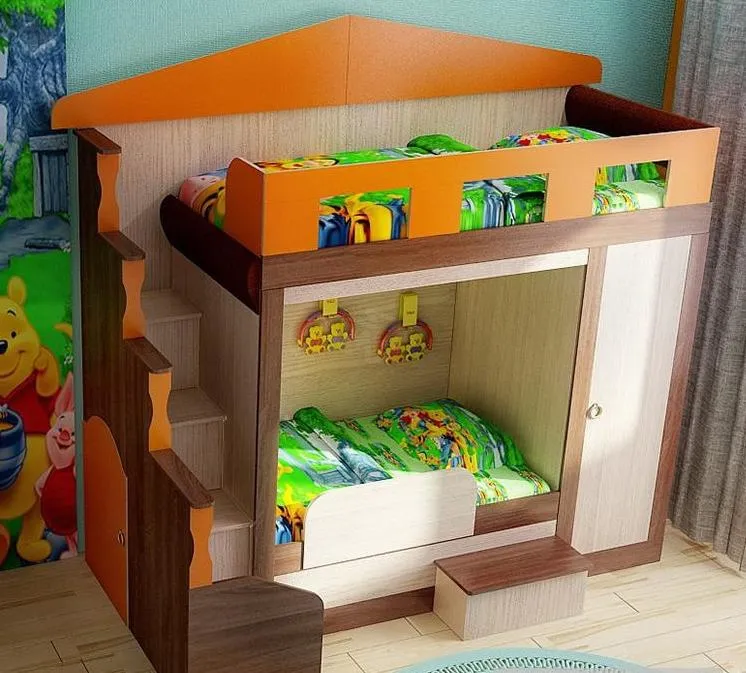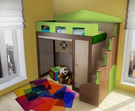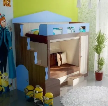 Под лестницей есть домик с дверцей для игр. Конструкция универсальна, к изделию прилагается схема сборки.