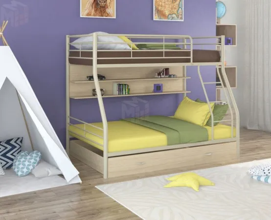 Металлическая двухъярусная кровать Гранада - 2 ПЯ с ящиками и полками от производителя "Формула мебели" способна выдерживать нагрузку до 180 кг (на одно спальное место), что делает ее подходящей как для детей, так и для взрослых. Конструкция кровати предусматривает спальные места разных размеров. В отличие от кроватей из ЛДСП выглядит менее громоздкой. В комплект входит прочная лестница.