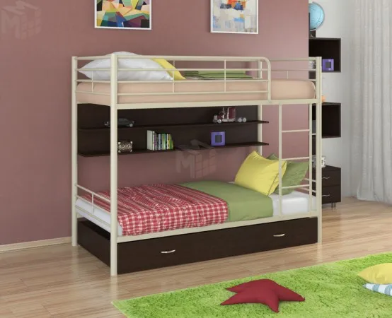 Металлическая двухъярусная кровать Севилья - 3 ПЯ с ящиками и полками от производителя "Формула мебели" способна выдерживать нагрузку до 180 кг (на одно спальное место), что делает ее подходящей как для детей, так и для взрослых. В отличие от кроватей из ЛДСП выглядит менее громоздкой. В комплект входит прочная лестница, которую по Вашему желанию можно установить справа или слева.