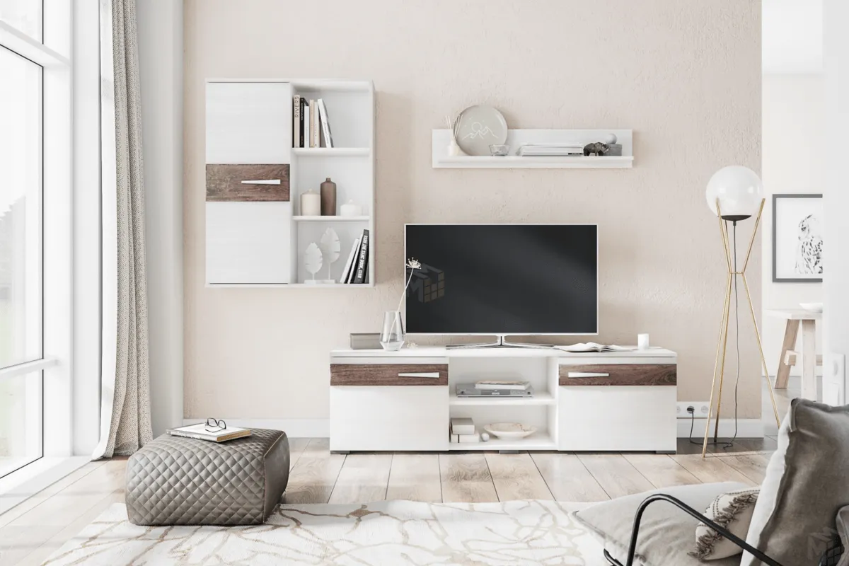 Гостиная Акита (вариант 2) поможет со вкусом обустроить уютную и комфортную комнату. На открытых полочках будут гармонично смотреться семейные фотографии, интересные книги и оригинальные предметы декора. За распашной дверцей найдется место для хранения посуды, семейных фотоальбомов, а также одежды и других вещей. Тумба ТВ поможет разместить телевизор для более комфортного просмотра новостей, сериалов и различных телепередач. Открытая ниша предназначена для необходимой аппаратуры. А полки, скрытые за распашными дверцами, пригодятся для хранения различных вещей и предметов. -