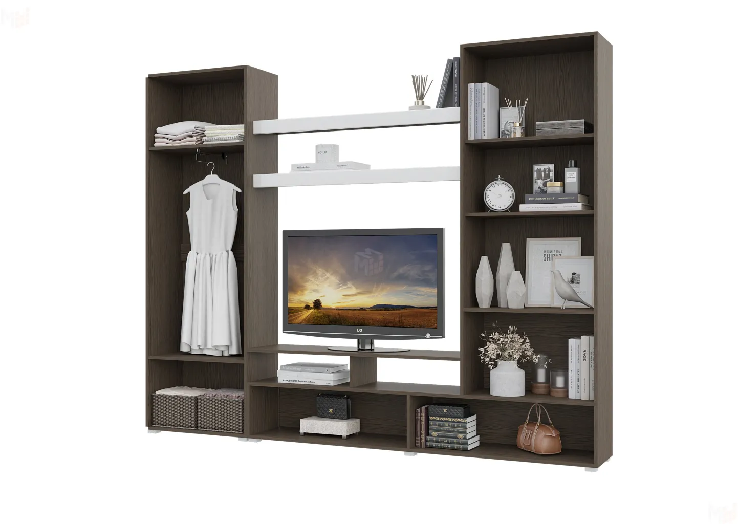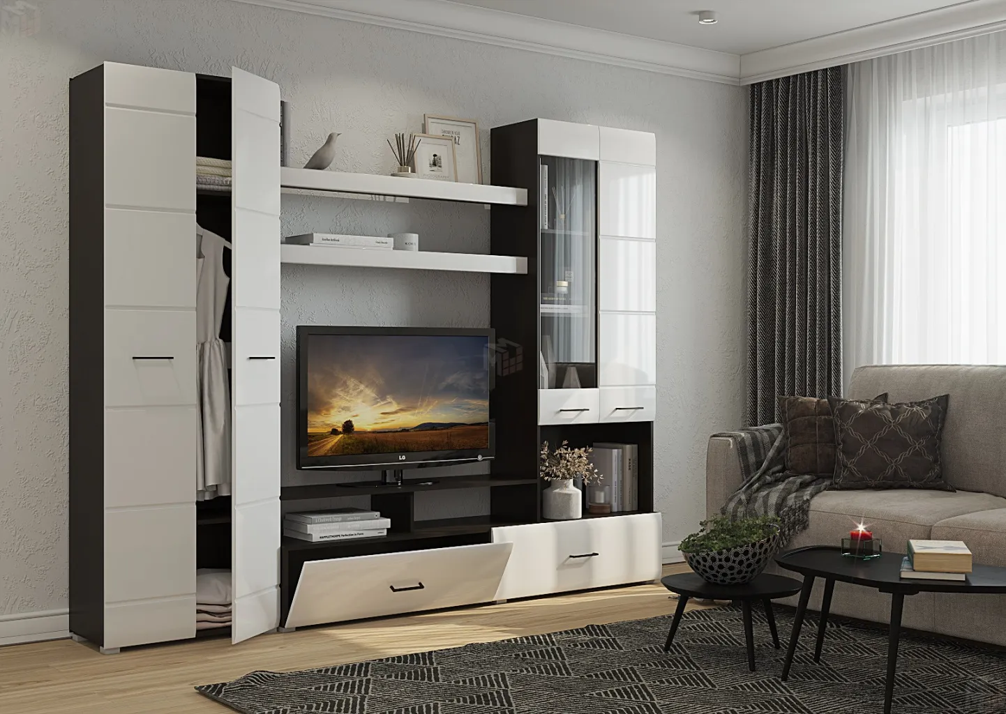 Лаконичная стенка Альфа с глянцевым фасадом и горизонтальной фрезеровкой идеально подойдет для современных гостиных.