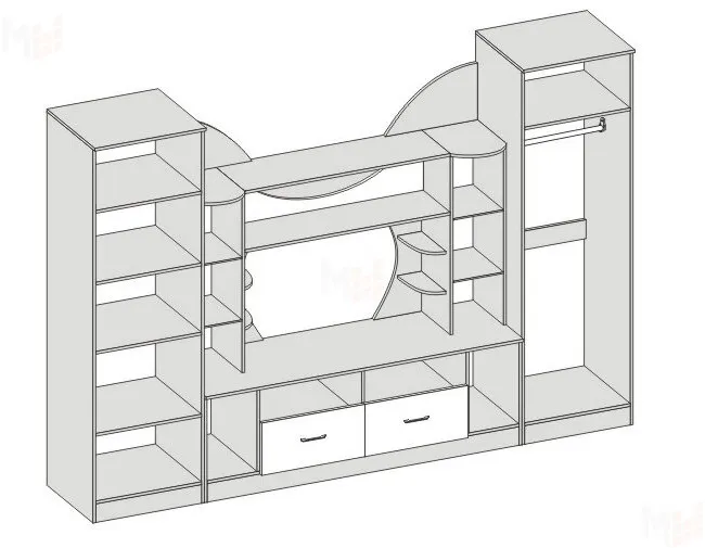 Центральная секция (полки для книг, тумба под телевизор, шкафы - витрины с тонированным гнутым стеклом);