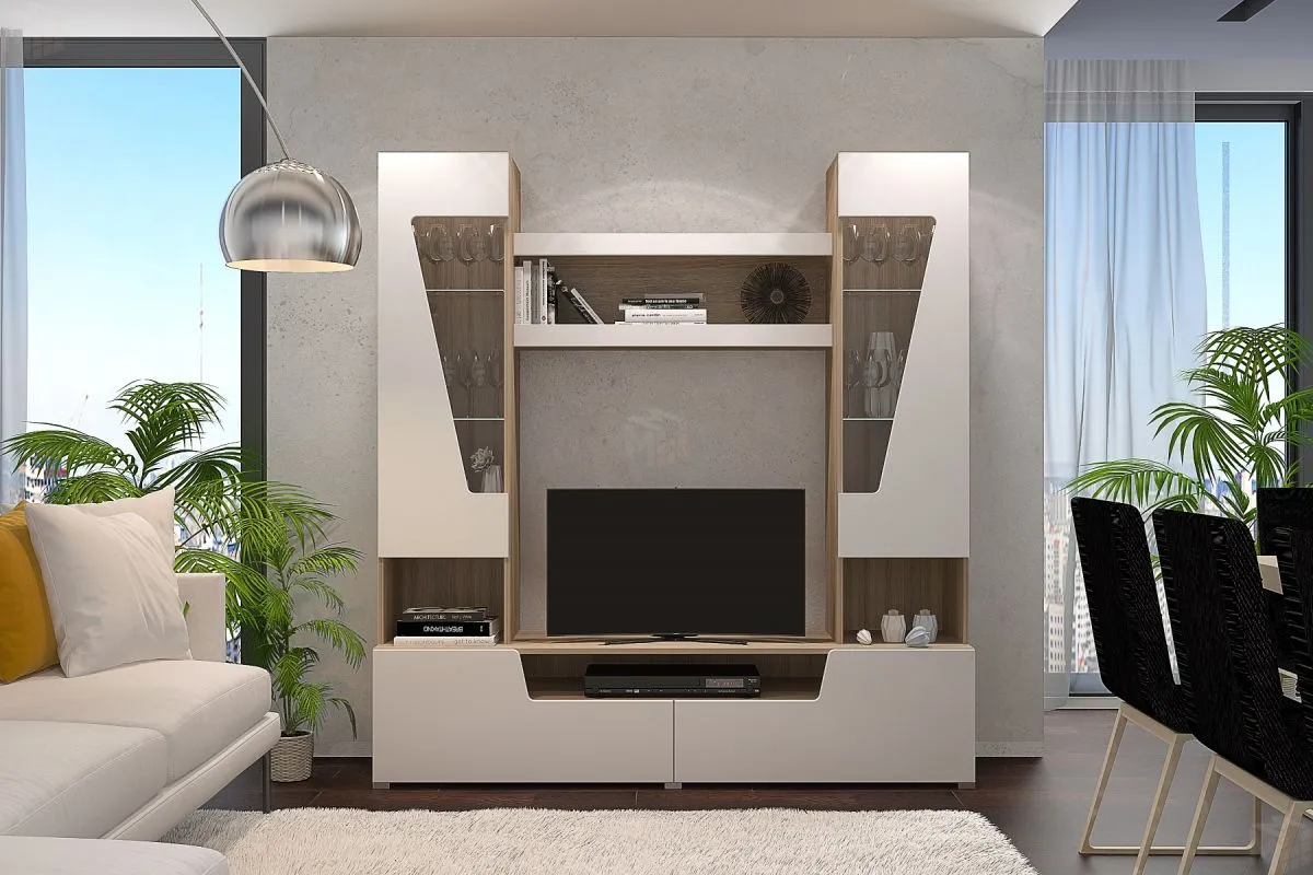 Отсутствие ручек является особенностью серии "Анталия", что придает современный и лаконичный внешний вид. В состав гостиной "Анталия" входит вместительный шкаф, а добавив комод можно получить еще больше места для хранения.