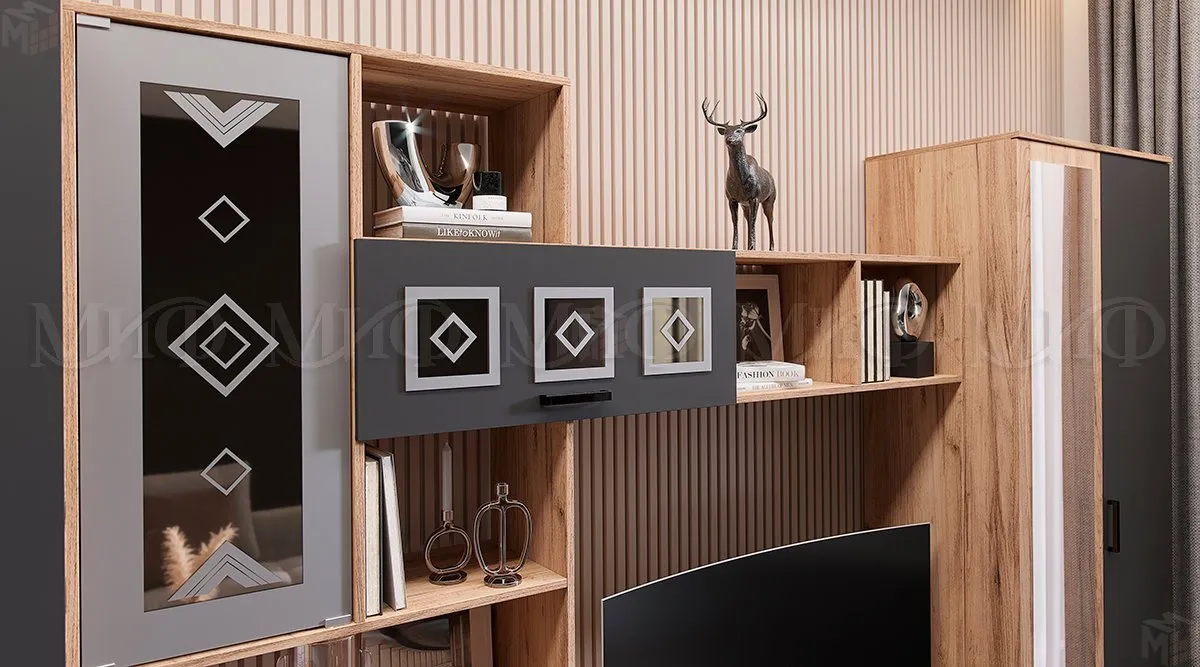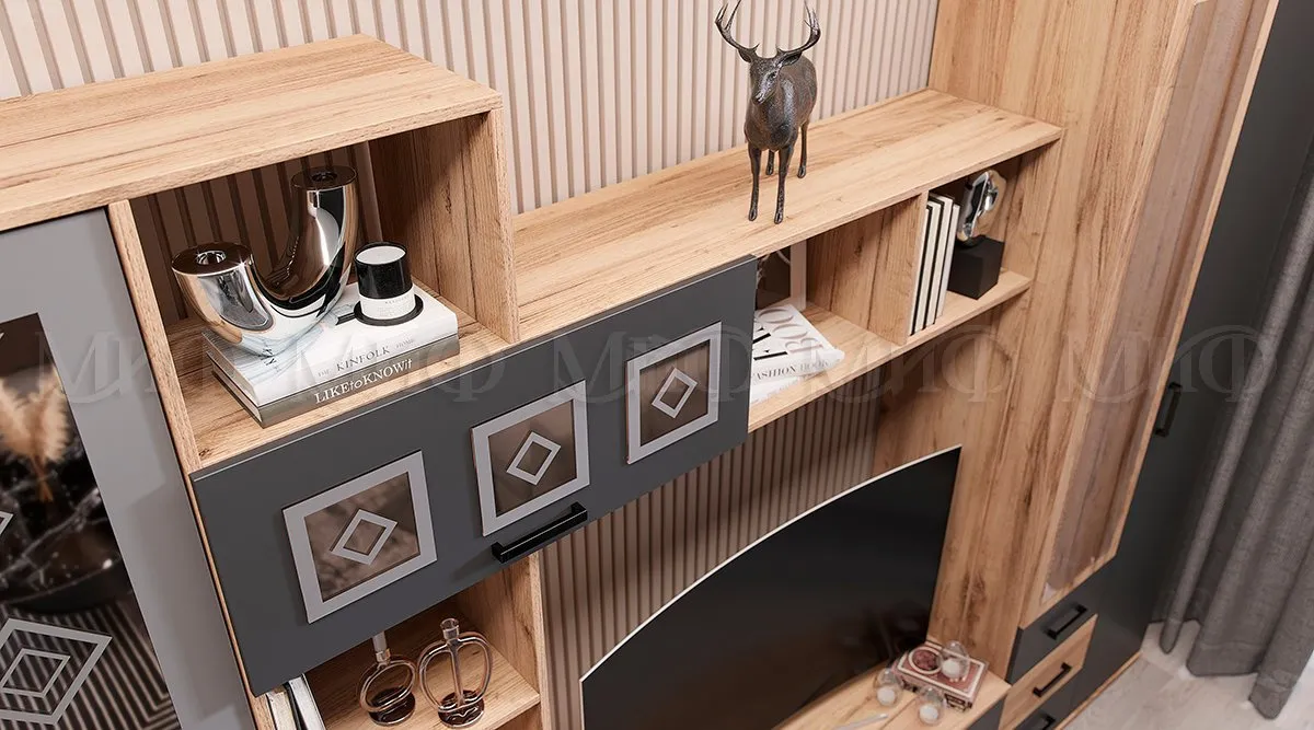 - центральная секция оснащена комодом, тумбой под ТВ, стеклостворкой под книги или посуду и полками под различные мелочи. Ниша ТВ 1184х1010 мм.