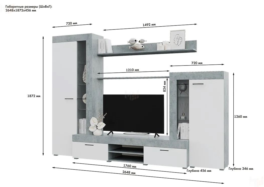 ширина 2648 мм, глубина 456 мм, высота 1872 мм
