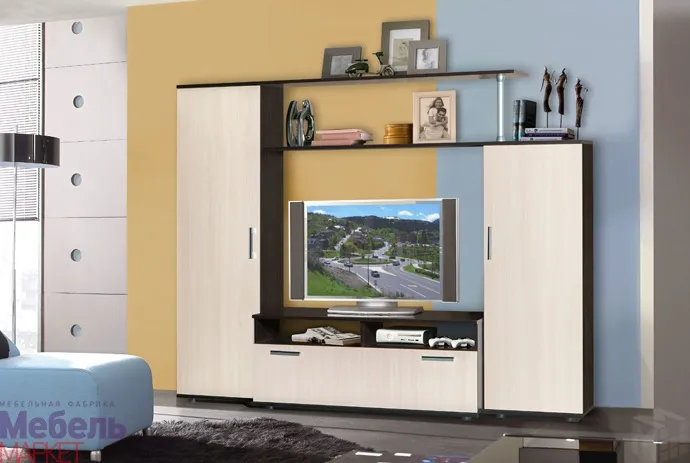 Гостиная Флокс 1 – идеальный вариант для тех, кто ищет бюджетное, но в тоже время элегантное решение для небольшой гостиной. С помощью этой небольшой горки, сочетающей в себе контрастные цвета, простые геометрические формы и удобный функционал, можно отлично укомплектовать небольшую комнату, решив все сопутствующие задачи – с удобством разместить телевизор и все к нему прилагающееся, красиво расставить любимые безделушки и фотографии, спрятать все то, что вы хотите убрать с глаз, в просторных секциях с полками, да и просто украсить помещение хорошо продуманной и симпатичной моделью современной мебели. Каждая из вертикальных секций-пеналов содержит по три вместительные полки. В тумбе под телевизор присутствует большой выдвижной ящик для дисков и прочих мелочей. Лаконичный дизайн гостиной позволит удачно вписать ее практически в любой интерьер без ущерба для остальной остановки.